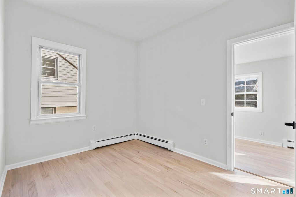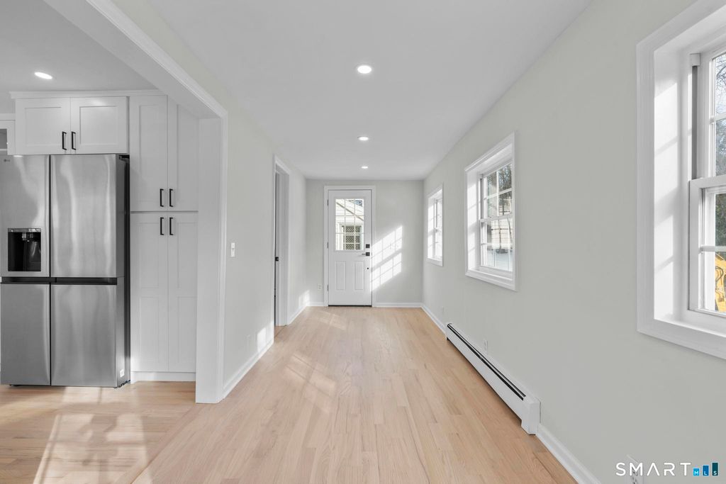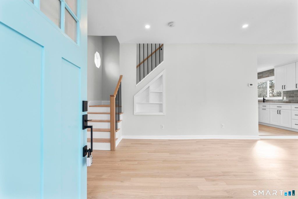 Welcome to this fully renovated 4 bedroom, 2 bath Colonial ideally located in the heart of Springdale. A charming front porch with a sleek standing seam metal roof creates a striking first impression and leads into a bright, oversized living room filled with natural light. An oversized sliding glass door opens to a brand new Trex style deck overlooking the backyard, creating a seamless flow for indoor and outdoor living. The stunning modern kitchen features shaker cabinetry w/ soft close drawers, quartz countertops, stainless steel appliances - a clean, timeless design. Adjacent to the kitchen is a dedicated dining area, along w/ a versatile 1st floor bedroom and/or home office w/ a beautifully renovated full bath featuring a stylish walk in shower. Upstairs, a luxurious primary suite offers vaulted ceilings & a spacious walk in closet. Two additional bedrooms and a brand new hall bath complete w/ a dual vanity, soaking tub, & sophisticated finishes. The lower level provides excellent flex space perfect for a den or playroom, with direct walk out access to the backyard. A well appointed laundry area with folding station, abundant basement storage, and additional attic storage enhance the home's functionality. Natural gas, city water, and city sewer, perfectly positioned on a quiet street just minutes from the Springdale train station, local shops, restaurants, downtown Stamford, and convenient access to both I95 and the Merritt Parkway. Modern living at its finest!