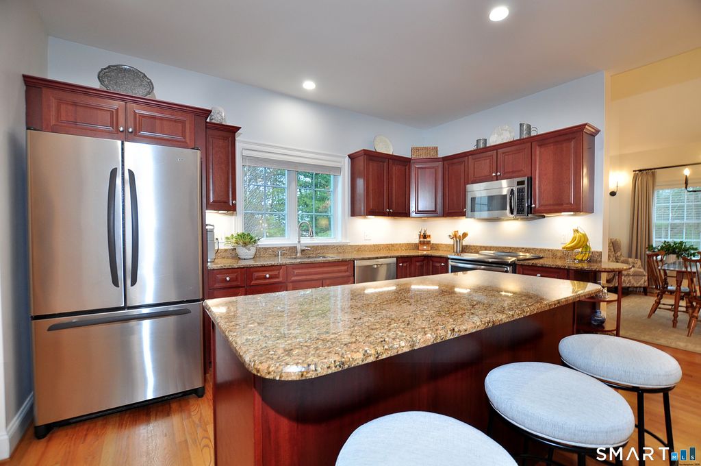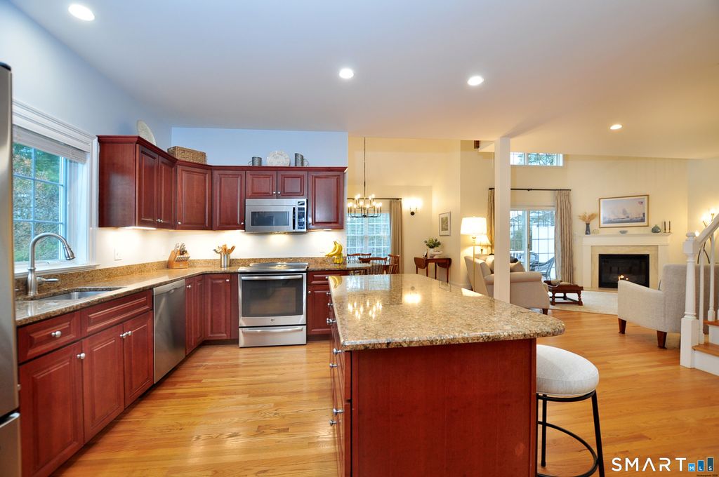 Welcome to Hunt Glen, Granby's premier 55+ community, and one of its very best locations. You will be truly surprised when you step inside this gorgeous, sun-filled, impeccably maintained home with upgrades galore. The granite and cherry kitchen features stainless steel appliances, abundant cabinetry, a center island, and wood floors, opening to a dining room with wood floors and vaulted ceiling and a spacious living room with wood floors, gas fireplace and slider to a newer deck. The main level also includes a half bath and a primary bedroom with walk-in closet, new wood floor (11/24), and a beautifully remodeled full bath with tiled shower and quartz counters, with laundry hookup available in the bath for a compact washer/dryer. The second floor offers a bright guest suite with bedroom, sitting area, and remodeled full bath. The finished walk-out lower level is a dream, featuring a motorized stair glide, french doors to the backyard, half bath, office, laundry room with new LG front-load washer and dryer on pedestals (2025), and abundant storage. Recent updates include new furnace and central air (6/22), new hot water heater (11/24), Bosch dishwasher (6/23), dining room chandelier and sconces (2023), composite deck and front porch (7/19), new zone board and programmable thermostats (1/20), and custom drapes and rods in the living room and dining room (3/20).