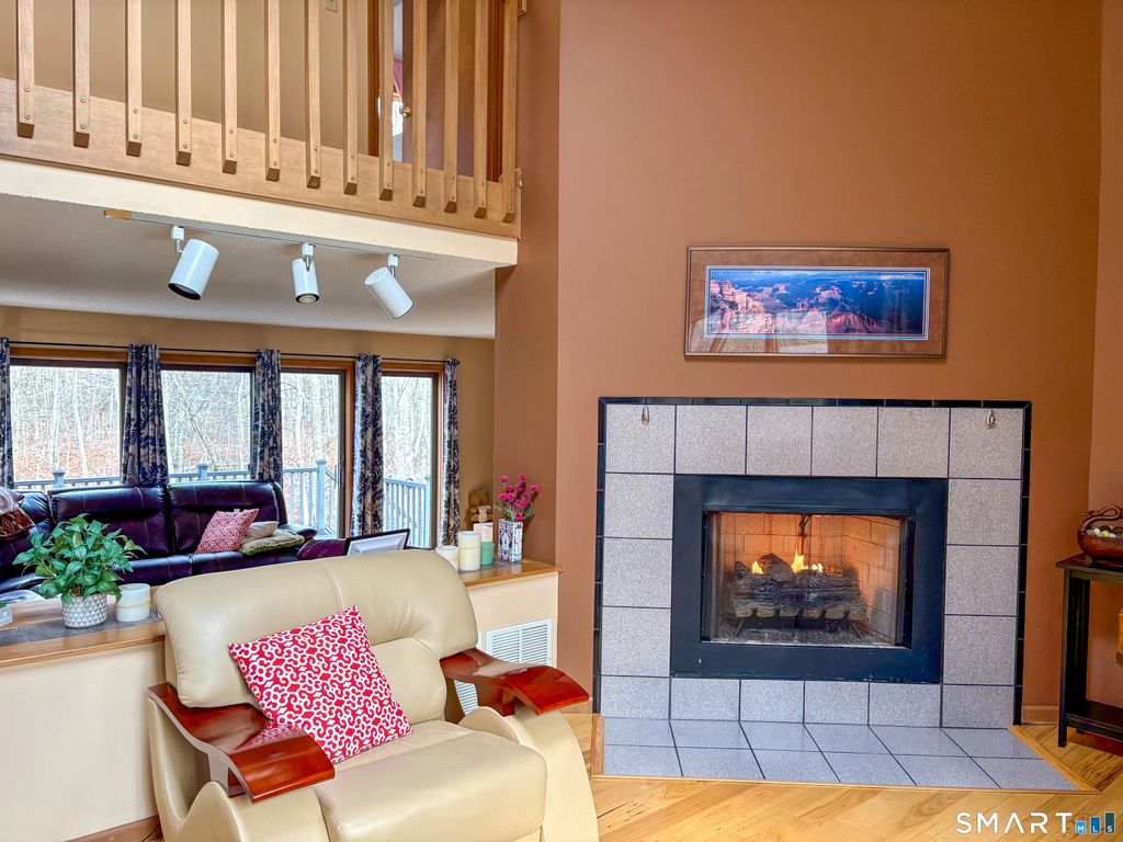 Nestled on nearly 5 private, wooded acres, this contemporary home offers space, privacy, and a peaceful setting with a small stream-fed pond on the property. The home features 8 rooms, including 4 bedrooms and 3 1/2 baths (town card only states 2 1/2), an updated kitchen with access to a large composite deck, and beautiful hardwood floors throughout. The first floor includes a spacious living room with a fireplace, a family room with piping for a wood stove, sliders to the deck and a first-floor office with barn doors, providing the perfect work-from-home space. The finished walkout basement adds great flexibility, offering a bedroom, two living areas, and a full bath, ideal for a potential in-law setup, guest suite, game room, etc. Additional highlights include a 2-car garage; two outbuildings one of which is a shed that has electricity and one area that still has electrical wiring run to it (previously used as a greenhouse). House is equipped with generator-ready hookup. A wonderful opportunity for those seeking privacy, nature, and versatile living space.