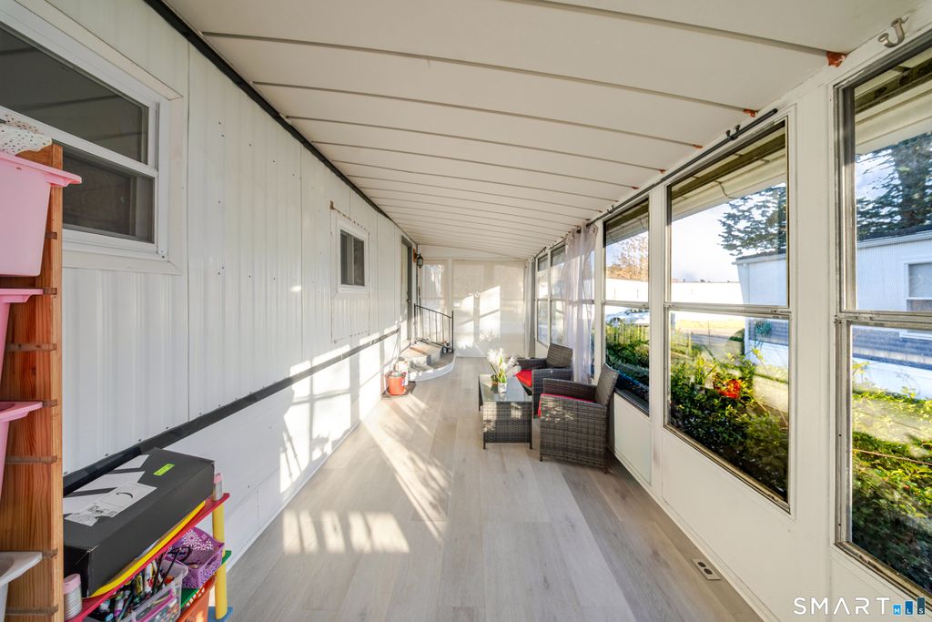 Located in a wonderful, private mobile home community, this updated, turnkey home stands out by offering more outdoor space, greater separation, and modern upgrades than many homes in the community. Positioned on a desirable corner lot, it provides added privacy that is rarely found in this setting. Inside, the bright, open floor plan features fresh paint throughout, new kitchen cabinets, new countertops, a brand-new microwave, and newer stainless steel appliances. The bathroom includes a washer/dryer combo unit for added convenience. Two enclosed porches-front and rear-offer versatile bonus space for storage, relaxing, or everyday use. Additional highlights include a private shed, a driveway with parking for up to three vehicles, and low-maintenance living, with HOA fees covering most major expenses. Residents enjoy outstanding amenities including access to a private community hall available to owners for just $50, ideal for hosting gatherings or special events. Also right outside the community there is a public swimming pool, basketball court, tennis court, and more! This is a rare opportunity to own an updated home in East Hartford for under $100,000.