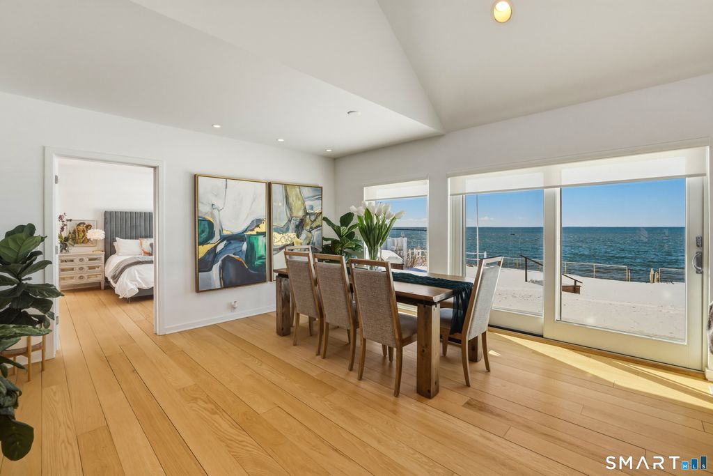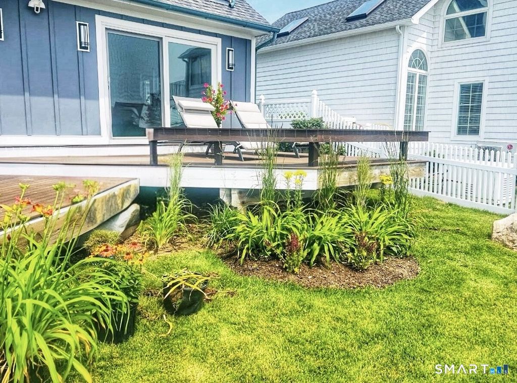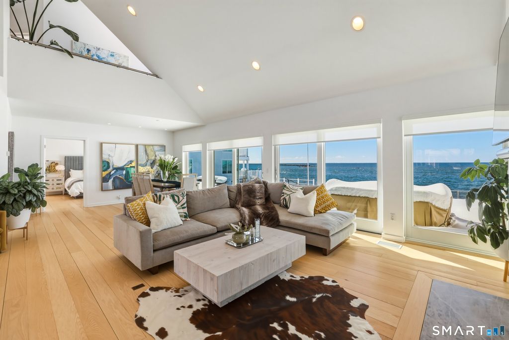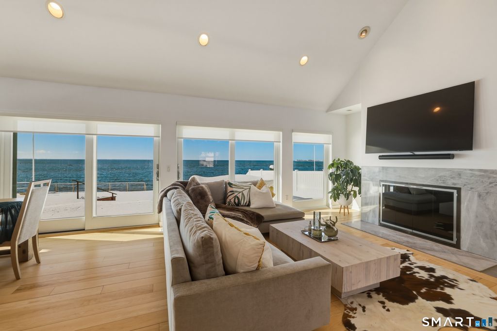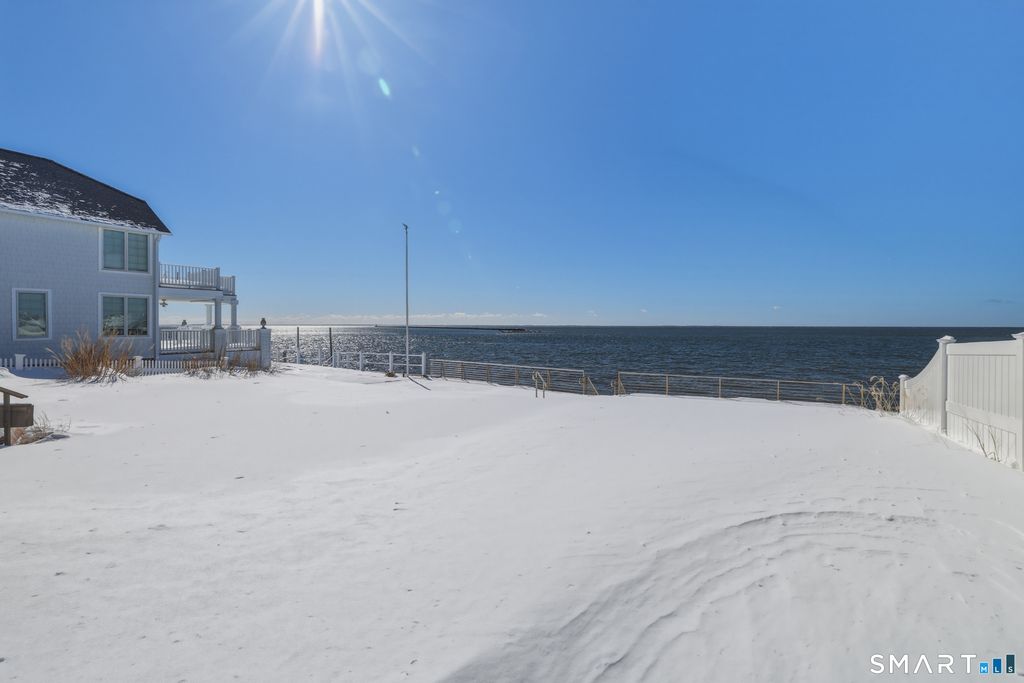 SPECTACULAR YEAR-ROUND WATERFRONT PROPERTY A rare opportunity to enjoy the unmatched lifestyle of waterfront living with sweeping panoramic views of the sea. Designed to maximize water views from nearly every main-level room, this seaside retreat offers an open floor plan ideal for entertaining, featuring a light-filled kitchen, dramatic two-story living room with cathedral ceiling and wood-burning fireplace, and sliders to an expansive deck. The first-floor master suite offers one-floor living with walk-in closet, full bath, and deck access overlooking the water; laundry is also on the main level. Upstairs includes additional bedrooms, a large bonus/recreation room, and multiple loft spaces; perfect for a home office, gym, or studio. Step outside to a lush lawn, spacious patio, and stairs to the water; ideal for relaxing, entertaining, and making memories in every season. Set on a 1/4-acre lot with approx. 60' of frontage on Long Island Sound, the home sits high above the flood hazard plane and is protected by a brand new seawall-NO FLOOD INSURANCE REQUIRED. The current owner has made significant improvements, including all newly renovated bathrooms and major infrastructure updates. Additional features include central A/C, wood floors throughout, deck with two awnings, 2-car garage (plus one bay is tandem, excellent storage, full dry basement, generator transfer switch. Originally a 1910 home, it was torn down and rebuilt by a previous owner.