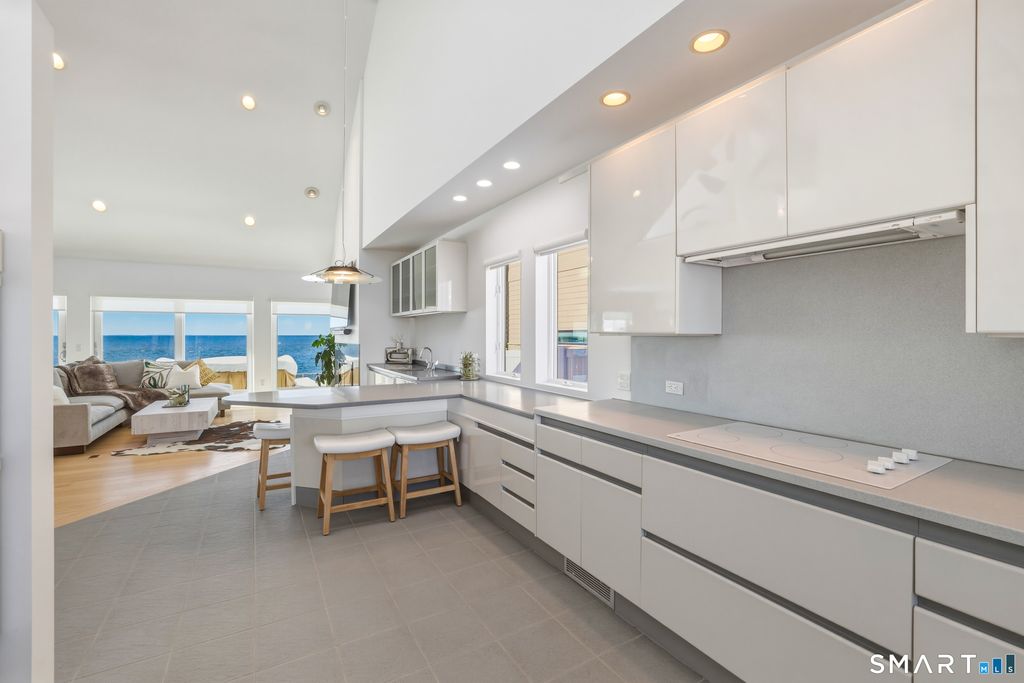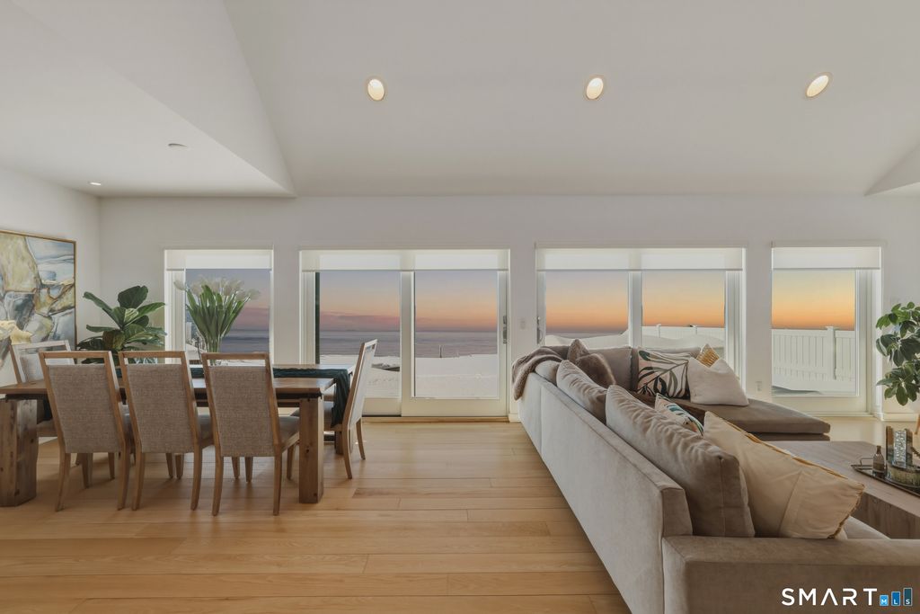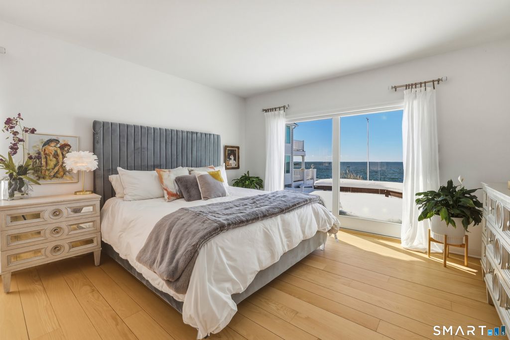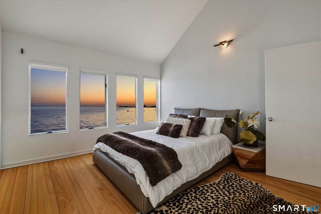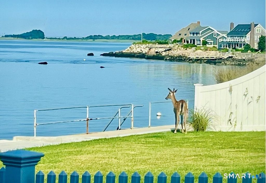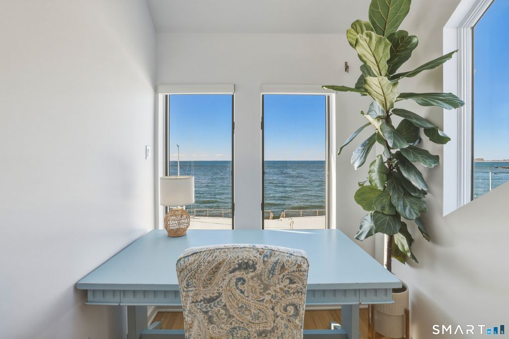 SPECTACULAR YEAR-ROUND WATERFRONT PROPERTY A rare opportunity to enjoy the unmatched lifestyle of waterfront living with sweeping panoramic views of the sea. Designed to maximize water views from nearly every main-level room, this seaside retreat offers an open floor plan ideal for entertaining, featuring a light-filled kitchen, dramatic two-story living room with cathedral ceiling and wood-burning fireplace, and sliders to an expansive deck. The first-floor master suite offers one-floor living with walk-in closet, full bath, and deck access overlooking the water; laundry is also on the main level. Upstairs includes additional bedrooms, a large bonus/recreation room, and multiple loft spaces; perfect for a home office, gym, or studio. Step outside to a lush lawn, spacious patio, and stairs to the water; ideal for relaxing, entertaining, and making memories in every season. Set on a 1/4-acre lot with approx. 60' of frontage on Long Island Sound, the home sits high above the flood hazard plane and is protected by a brand new seawall-NO FLOOD INSURANCE REQUIRED. The current owner has made significant improvements, including all newly renovated bathrooms and major infrastructure updates. Additional features include central A/C, wood floors throughout, deck with two awnings, 2-car garage (plus one bay is tandem, excellent storage, full dry basement, generator transfer switch. Originally a 1910 home, it was torn down and rebuilt by a previous owner.