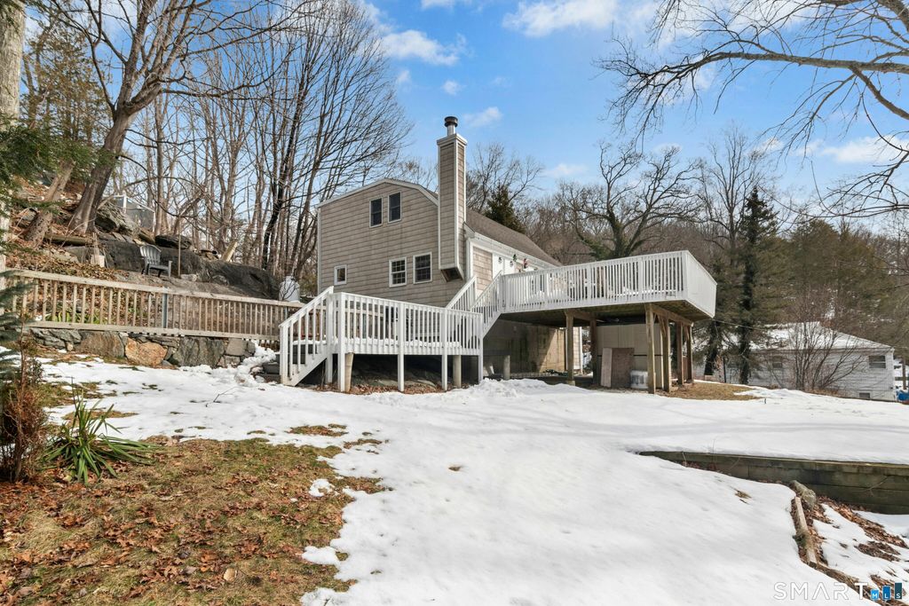 Welcome to this charming Cape-style home tucked away like a little cottage in the woods, offering privacy, comfort, and turnkey living in desirable Shelton. Perfect for a first-time homebuyer or anyone looking to downsize without sacrificing space or style, this home blends warmth and modern updates beautifully. The main level features an open-concept living area flowing seamlessly into a fully updated kitchen complete with stainless steel appliances, quartz countertops, and an eat-in breakfast bar-ideal for everyday living and casual entertaining. Sliders off the living room lead to an oversized deck overlooking Fall Mill River, where you'll enjoy peaceful views and exceptional privacy. Also on the first floor is a versatile room with a wood-burning fireplace, perfect as a bedroom, cozy den, home office, or dining space. Upstairs, you'll find two comfortable bedrooms and a half bath, accented by vinyl wood-look flooring for easy maintenance and style. Additional highlights include newer bathrooms and kitchen, newer appliances, propane heat and hot water, and a new furnace installed just one year ago, with all ductwork already in place for future central air. An unfinished walk-out basement offers laundry and ample storage, plus a shed conveniently located off the home for even more storage. Ideal for commuters, this home is just five minutes from the Merritt Parkway and I-95, and all of Shelton's amenities. This inviting home offers privacy, charm and modern comfort.