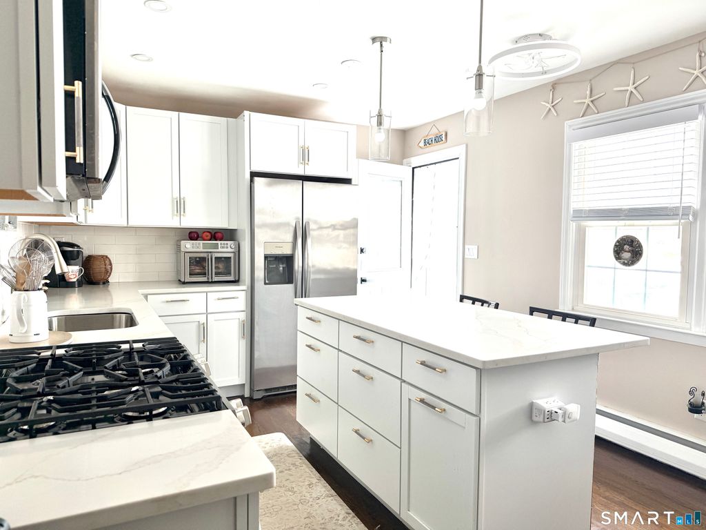 Step into this beautifully remodeled ranch-style home offering a flexible layout currently with 2 spacious bedrooms in the desirable Morris Cove neighborhood. Dining room can be converted back to a third bedroom. The show-stopping kitchen serves as the heart of the home, featuring brand-new cabinetry, a large center island, elegant quartz countertops, and stainless steel appliance, perfectly designed for both everyday living and entertaining. Gleaming hardwood floors flow throughout, adding warmth and sophistication. This home offers 1.5 updated baths and the convenience of a main-level washer and dryer one-unit combo. Enjoy outdoor living on the newer backyard deck or relax on the inviting front porch with low-maintenance Trex flooring. The expansive, open basement provides abundant storage and endless potential. With a new roof and landscaped front yard, this move-in ready home blends modern updates with timeless charm. Ideally located within walking distance to Fort Hale Park, the fishing pier, schools, and public transportation and just minutes from beaches, Yale, and I-95 and I-91. This home offers both comfort and convenience in one exceptional package.