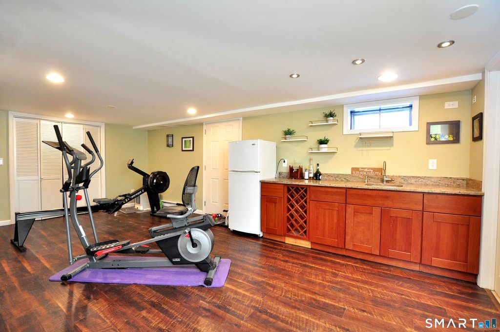 Classic New England Colonial in one of Simsbury's most desirable neighborhoods! This charming 4-bedroom, 2.2-bath Colonial shines with the gourmet chef's kitchen featuring premium GE Profile and GE Monogram stainless steel appliances, sleek granite countertops, marble tile backsplash, and a large center island complete with a built-in wine chiller and ample space for casual dining. The kitchen flows into the family room, with a cozy natural gas fireplace, built-in bookcases and abundant natural light, perfect for everyday living and entertaining. The first floor continues with a dining room ideal for holiday gatherings, a spacious living room or home office and a convenient half bath with laundry area. Upstairs, the primary suite is a private retreat with a full bath & four closets for storage. There are three additional bedrooms and another full bathroom. The finished lower level adds a rec room, a wet bar, space for a home gym, hobby area or office, and an additional half bath-ideal for movie nights, play areas, or hosting friends. Recent updates:new natural gas boiler, 200-amp electrical panel, sub-panel and 220V garage outlet (2021). Additional highlights include public water, natural gas utilities, central air & irrigation system. This exceptional home is within walking distance to Henry James Memorial School, Central School and Simsbury's vibrant town center with restaurants, shopping & parks. Schedule your showing of this beautiful Colonial today!