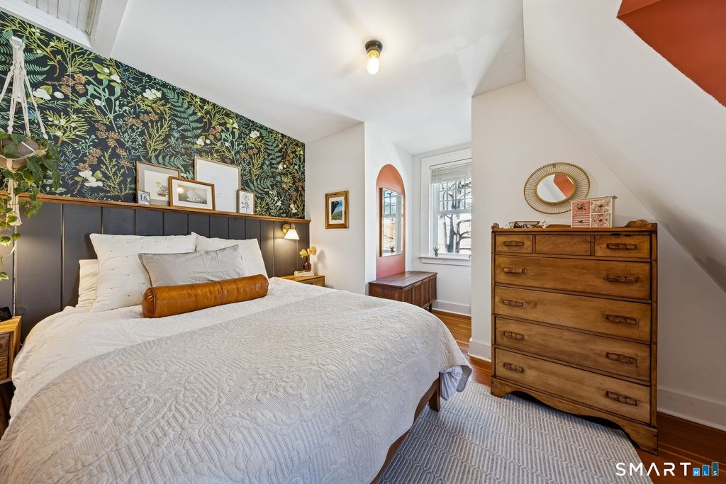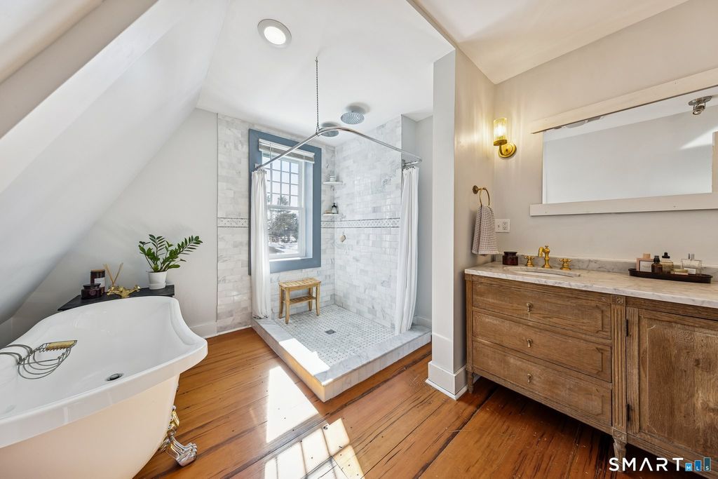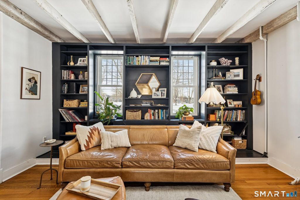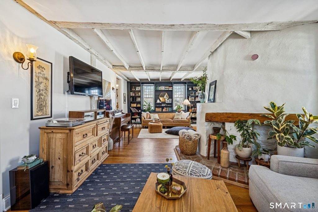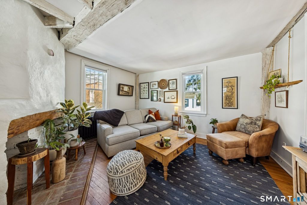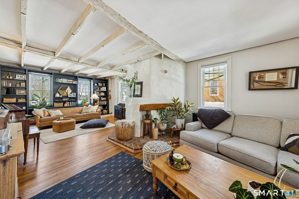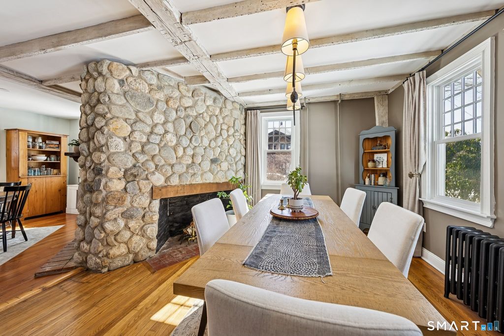 Imagine yourself in a beautifully renovated 18th century gambrel colonial overlooking the town green. This historic home, originally built by Stephen Thomason for his son Amos, blends period character with thoughtful modern updates. The large eat-in kitchen features granite countertops, stainless steel appliances, and plenty of workspace for cooking and gathering. Perhaps most impressive, are the four (of five total) stone and mortar fireplaces on the main level, they are served by two angled chimneys at each end of the home, which were a unique feature of the time. Contributing to the home's light and airy feel are its high first floor ceilings, beautifully accented by wood beam detailing. Upstairs, a luxurious full bath offers double sinks, a large walk-in shower, and a soaking tub. Hardwood floors run throughout the home, reinforcing its timeless feel. Outside, enjoy a large, level yard with a raised garden bed and new deck (2024) that is perfect for relaxing or entertaining. Owned solar panels (2021) provide lasting value for the next owner, complemented by a newer roof (2020), attic insulation (2020), updated windows (2023), a fenced garden area (2025), and repointed chimneys (2025). The location provides lovely views and seasonal enjoyment of a farmers market on the East Haven Green. Beacon Hill Preserve is just steps away. You are approximately 10 minutes to downtown New Haven and about 5 minutes to the beach.