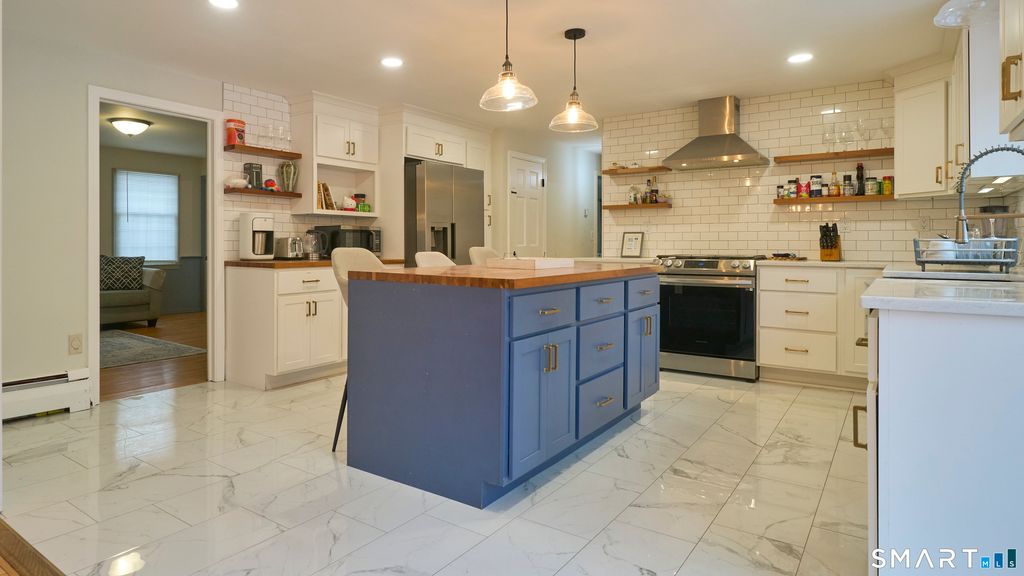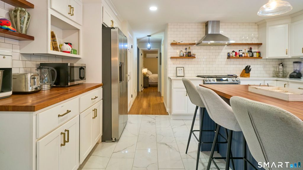 The quintessential gambrel colonial home, presenting timeless New England character - warm siding, welcoming proportions, and a setting that feels comfortably familiar. Inside, you'll discover a thoughtfully updated, spacious residence designed for everyday living and effortless gathering. The kitchen stands as the centerpiece, where carefully selected finishes blend enduring style with practical performance. Timeless white subway tile provides a clean, reflective backdrop that amplifies light while offering durable, easy-care surfaces suited to everyday cooking. Silestone quartz countertops deliver non-porous resilience and elegant continuity, combining stain resistance with long-term beauty that maintains its appearance through years of use. A butcher block-topped center island introduces warmth and tactile contrast, creating an inviting prep and gathering surface that naturally encourages conversation, casual dining, and shared moments. Open shelving adds to both appeal and convenience I think you'll love the European-designed hood, which serves as both an architectural statement and a functional asset, delivering effective ventilation while visually elevating the cooking zone into a design focal point. Expansive windows and thoughtful orientation invite abundant natural light, enhancing mood, reducing daytime lighting needs, and reinforcing the kitchen's role as an uplifting daily living environment rather than simply a workspace.