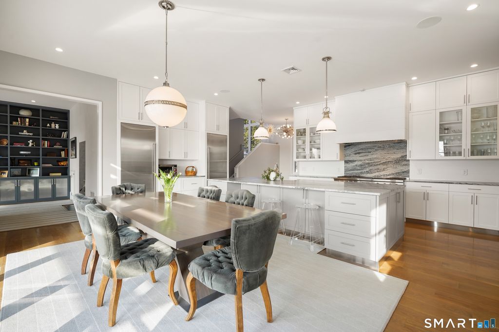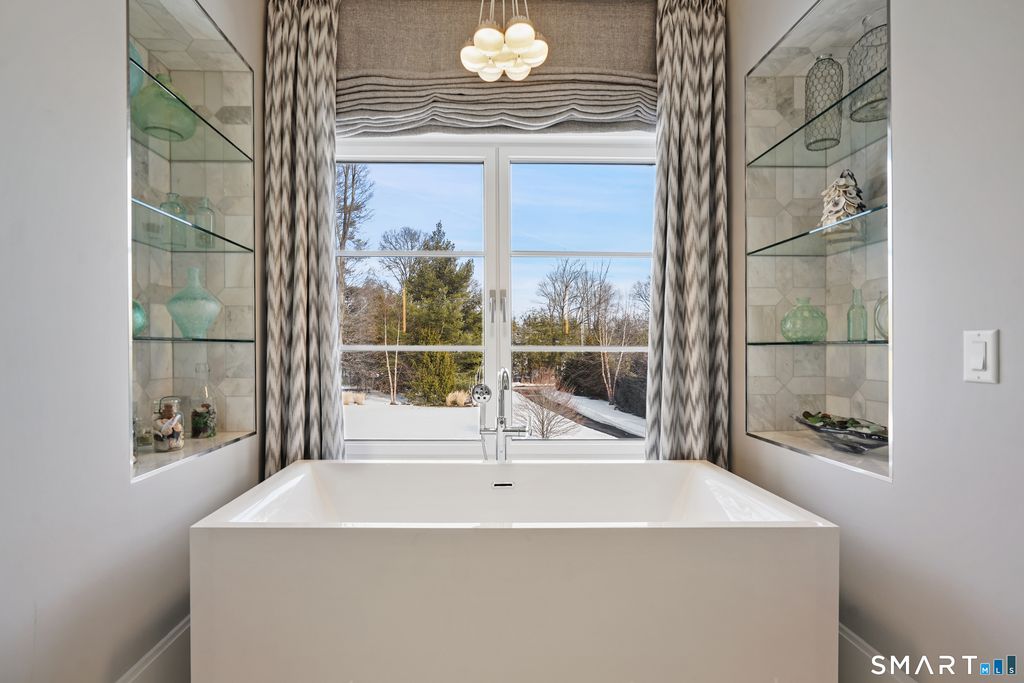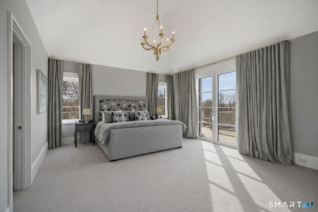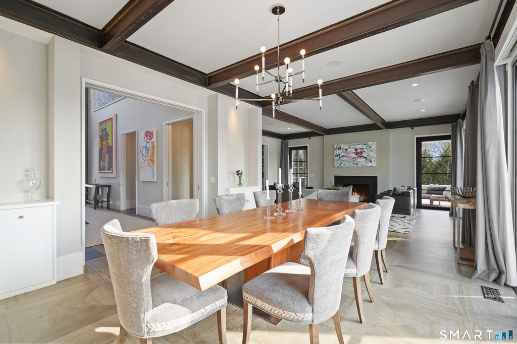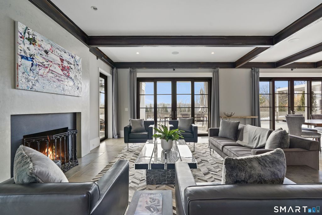 Sited on over two acres of private, west-facing land in the heart of Greenwich's coveted Golden Triangle, this architectural modern masterpiece commands attention. Designed in collaboration with renowned architect William D. Earls, this 11,000+ sq ft six-bedroom estate showcases timeless design, masterful craftsmanship, and refined sophistication. Completed in 2018, the residence blends bold contemporary lines with warm, livable elegance. Inside, soaring ceilings, dramatic steel-framed windows, and sunlit open spaces create an extraordinary sense of volume and light. The chef's kitchen is a showpiece, featuring Sub-Zero, Wolf, and Bosch appliances, HR Woodworking custom cabinetry, and bespoke finishes throughout. The luxurious primary suite serves as a serene retreat, featuring a spa-like bath, dual dressing rooms, fireplace, a private terrace, and sweeping sunset views. Expansive walls of glass open to a resort-style backyard with a Groppa saline pool and spa, sculpted gardens designed by Joseph Pajonas Studio and multiple terraces offering the ultimate in indoor-outdoor living and entertaining.
