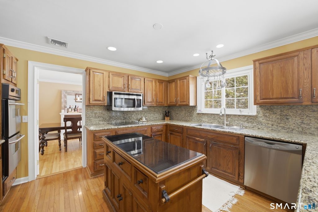 Welcome to this beautifully maintained North Stamford home, thoughtfully designed for comfortable living and effortless entertaining. Nestled on a quiet cul-de-sac and set back from the road, the property offers exceptional privacy and a serene setting. Inside, the spacious living room with a classic wood-burning fireplace creates a warm and inviting atmosphere and flows seamlessly into a formal dining room with direct access to the deck and backyard, perfect for gatherings and indoor-outdoor living. The large eat-in kitchen serves as the heart of the home, featuring a dedicated breakfast area, granite countertops, stainless steel appliances, a dual wall oven, and abundant cabinetry, while the adjoining family room offers a second wood-burning fireplace, a powder room, and additional access to the deck and yard. Upstairs, the primary suite provides a true retreat with a private full bathroom and walk-in closet, complemented by four additional bedrooms, and another full bath. The expansive lower level adds valuable flexibility with a large recreation room, private office, and plentiful storage. A two-car garage with high ceilings completes the home. Ideally located just minutes from the Merritt Parkway, shopping, and dining, this property combines privacy, space, and everyday convenience in one exceptional offering.
