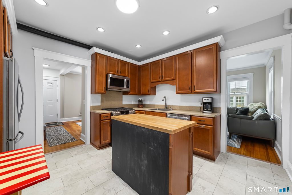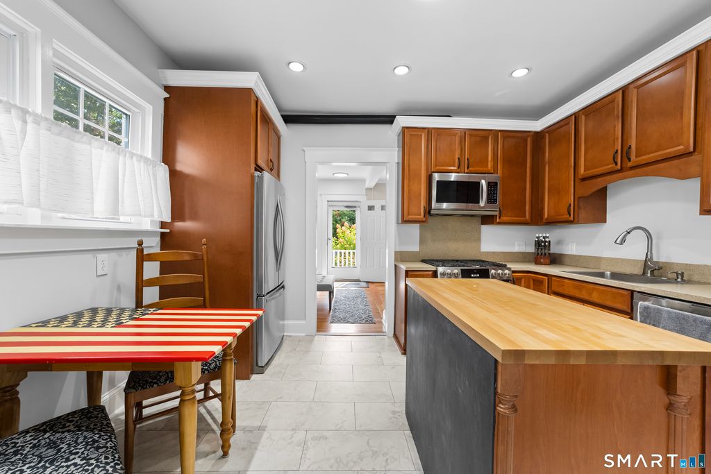 Prime Darien location offering easy access to the Noroton Heights train station, everyday shopping, and public beaches. This charming, older 3-bedroom, 2-full-bath Colonial blends classic character with practical modern updates. Interior features include high ceilings, central air, classic moldings, and hardwood floors throughout. The home has been updated with newly renovated bathrooms, refreshed bedrooms, and an eat-in kitchen fitted with new appliances and soft-close cabinetry. A spacious mudroom sits directly off the kitchen for convenient everyday storage. Exterior features include an inviting deck overlooking a private, level backyard. Detached one car garage and ample driveway parking.
