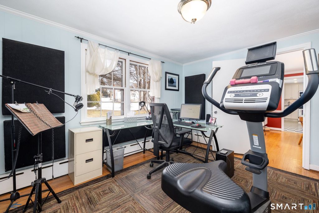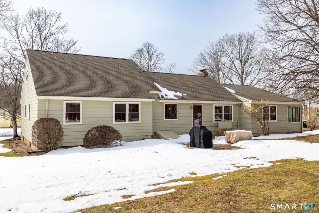 This center hall ranch blends sun-filled living spaces, thoughtful updates & a very special neighborhood setting - creating a home that truly stands out. The living room welcomes you with a southern facing picture window & a wood burning fireplace. The dining room includes built-ins flanking the window adding both charm & functionality. You will appreciate the dedicated home office-or a flexible space that can be tailored to your needs-that leads to a cozy, enclosed porch. This inviting space is perfect for morning coffee, quiet reading or simply unwinding while enjoying views of the outdoors. The beautifully remodeled kitchen has white cabinetry, a stylish backsplash, granite countertops, a large center island & stainless steel appliances. Additionally, there are three comfortable bedrooms & two remodeled full bathrooms, including a spacious primary suite with an ensuite bath. The lower level expands your living space with a home office & a recording studio-ideal for remote work, creative pursuits, or hobbies. You'll also find extensive storage & generous open space well suited for a workshop, exercise area or future customization. Additional particulars include hardwood flooring, roof-2020, gas boiler/hot water heater-2025, 2 car garage & a walkup attic that provides excellent expansion potential. A lovely three-season patio offers an inviting space for outdoor dining or gathering with friends. Ox Yoke is a special neighborhood, known for its annual block party,