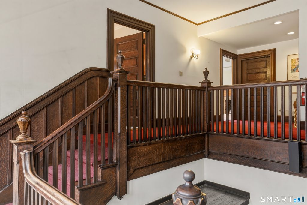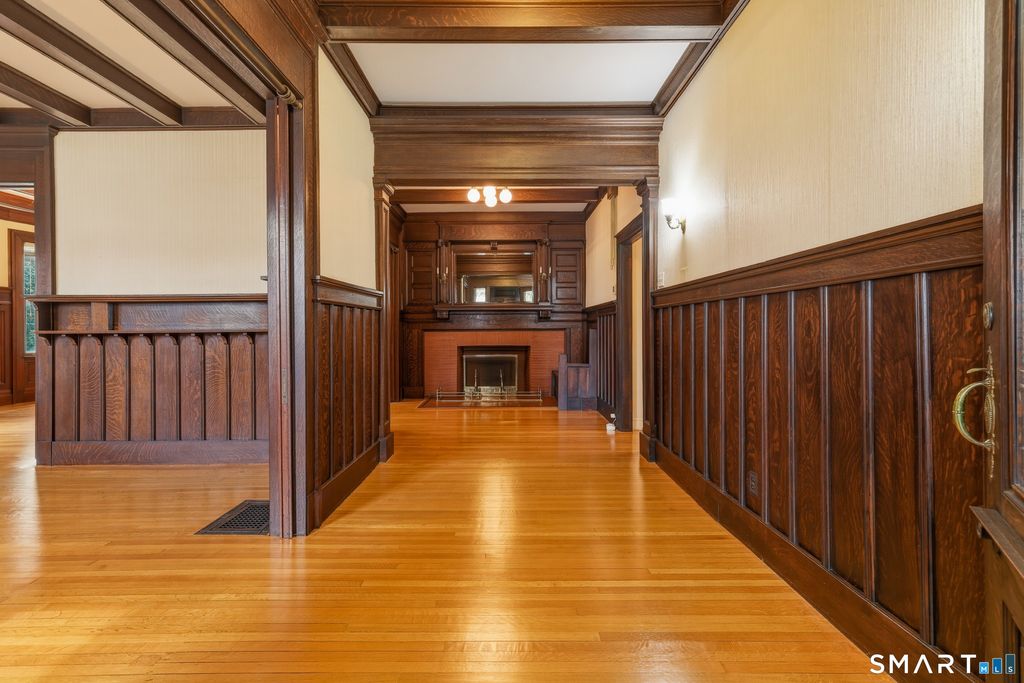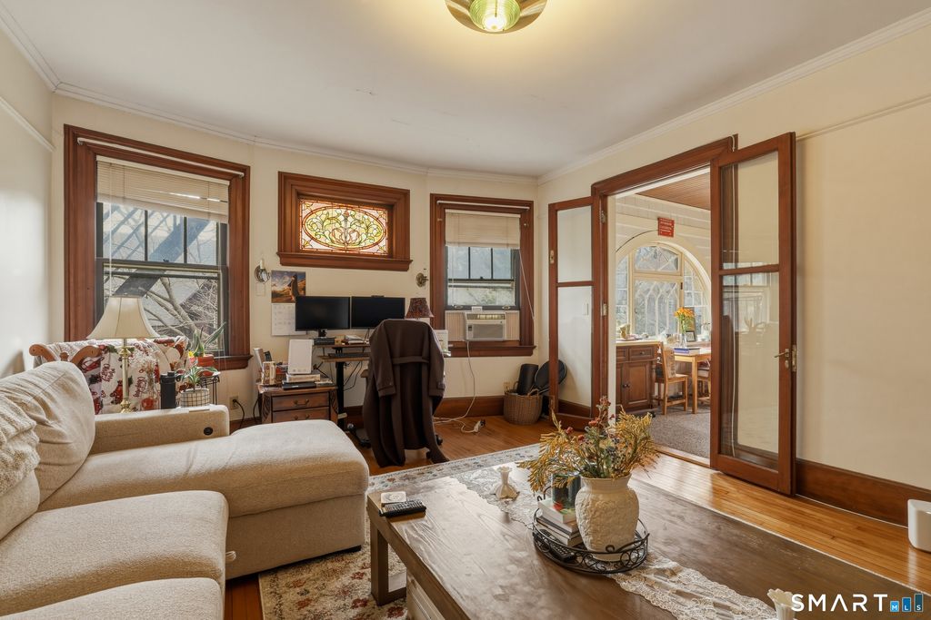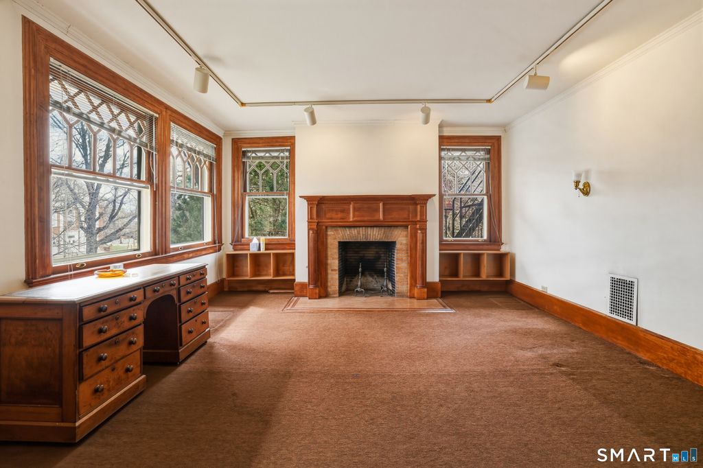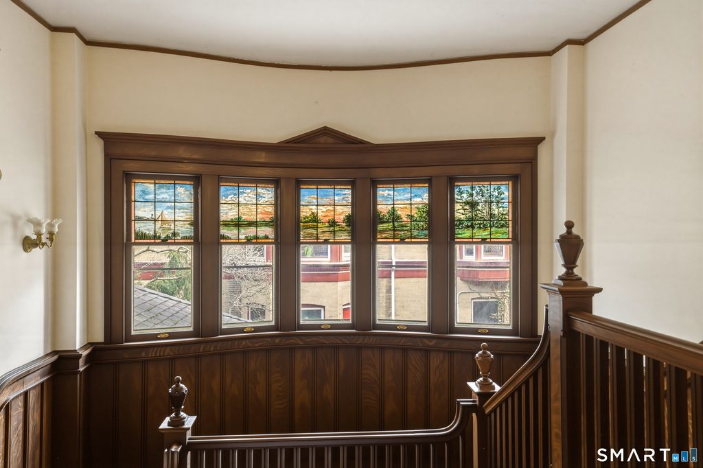 Stately 1905 mansion, originally built for Elihu A. Beckley as a wedding gift for his wife, seamlessly blends historic grandeur with thoughtful updates. Converted in 1953 into a four-unit residence, it offers a remarkable owner's unit while preserving nearly all original architectural details, including soaring 10-foot ceilings, rich woodwork, corner built-ins, restored brass light fixtures, striking fireplaces, exposed beams, paneled walls, and exquisite stained glass windows. The owner's unit showcases a grand entry foyer, an elegant living room with fireplace, a spacious primary bedroom with fireplace, and a second bedroom with custom built-ins and en-suite bath. A distinctive mid-century kitchen features a circular dining area encircled by windows, creating a bright and inviting space. Additional units offer flexibility and income potential. The 2nd floor apartment includes a generous 1-bedroom layout with a large living room, updated kitchen, and a bath retaining much of its original tilework. Another unit, currently used as a 2-room owner's office, features equally sized living & bedroom spaces, both with fireplaces (this unit has custom sound proofing in the walls, floors and ceilings); there is a kitchenette hidden behind custom built-ins. The 3rd floor encompasses a full-floor 6-room apartment, currently configured as a 2-bedroom but easily adaptable to 3 bedrooms.