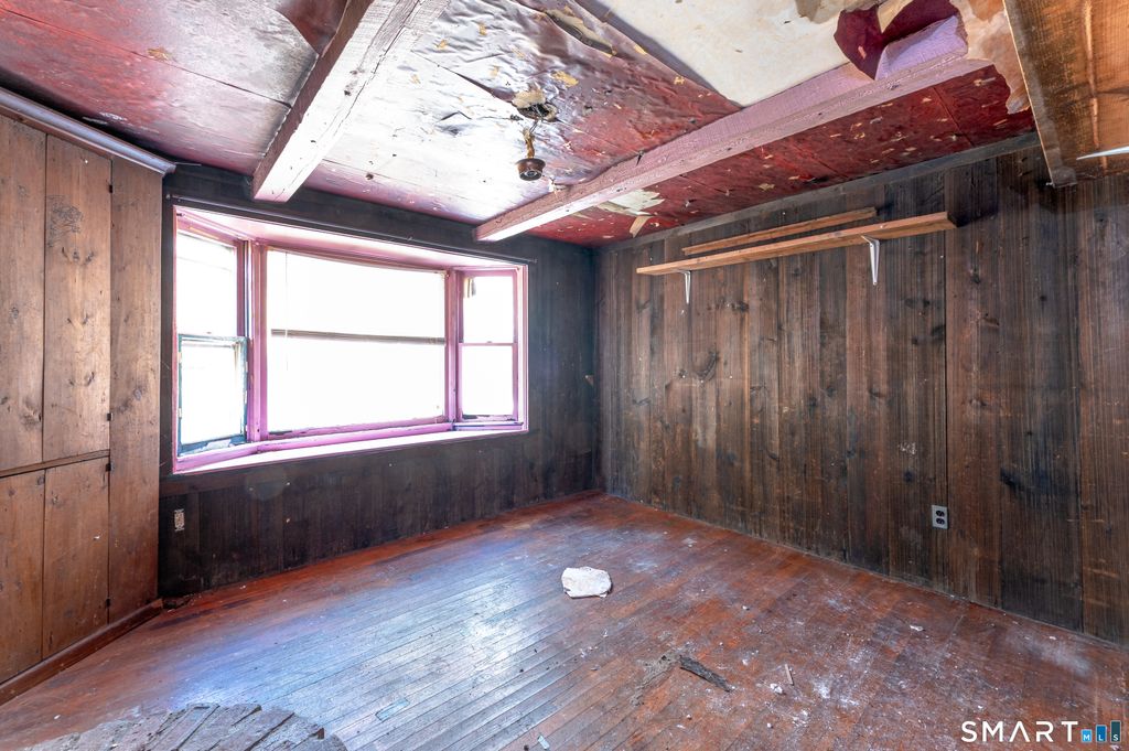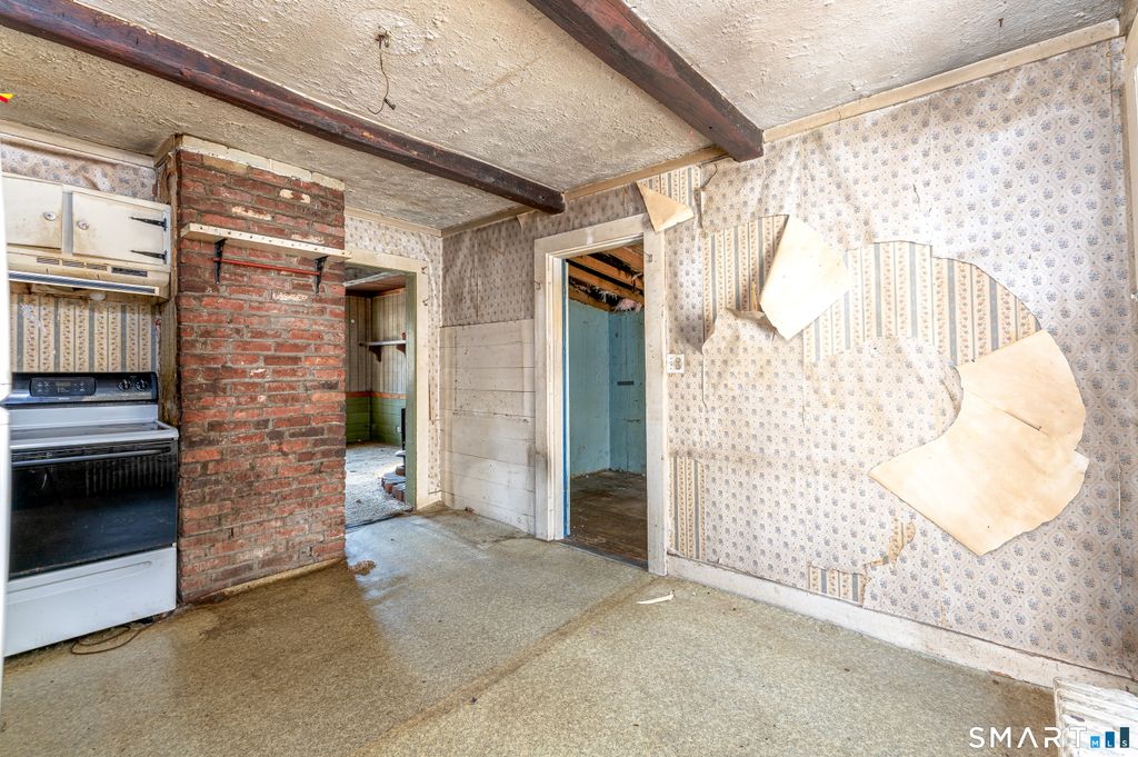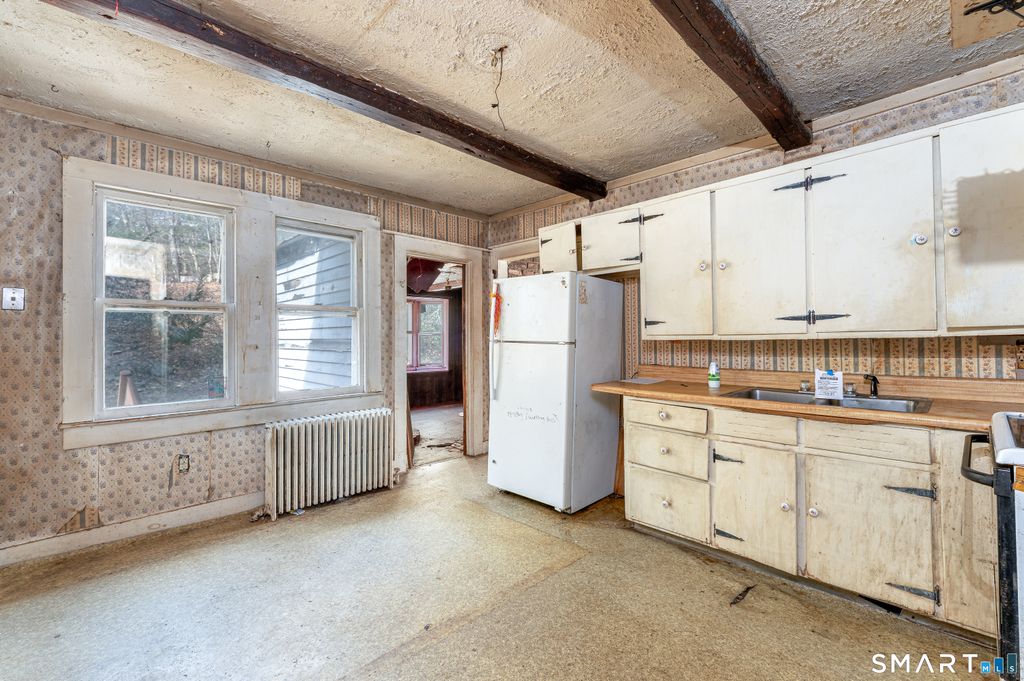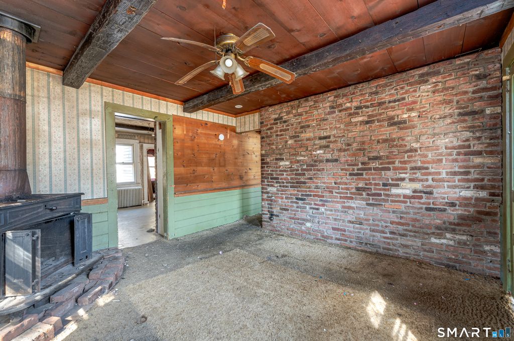 Tucked along a lightly wooded stretch of East Hill Road, this charming ranch presents a rare opportunity to reimagine a classic New England property set on approximately 2.7 acres of peaceful, natural surroundings. Full of character and possibility, the home offers 5 rooms including 2 bedrooms and 1 full bath across 961 square feet, providing a comfortable footprint ready for thoughtful renovation or future expansion. Inside, the layout features a living room with exposed beams and a wood stove, a kitchen with eating space and double sink, a dining room with hardwood flooring, and bedrooms that continue the warm, rustic feel of the home. A full basement adds additional storage or workshop potential, while the detached one car garage provides space for hobbies, equipment, or future creative use. The expansive lightly wooded property offers privacy, room to grow, and endless potential for outdoor living, gardens, or future improvements. Whether you are looking to restore the existing home, expand the footprint, or craft a completely personalized retreat, this property offers the ideal canvas for a visionary buyer ready to bring new life to a classic Canton setting.