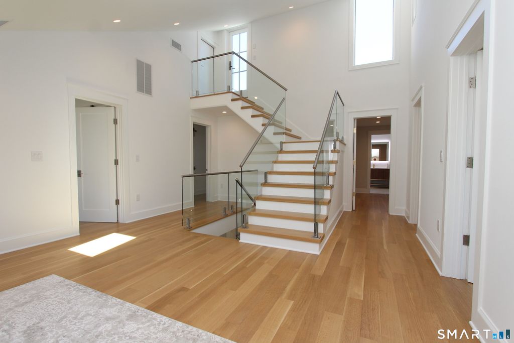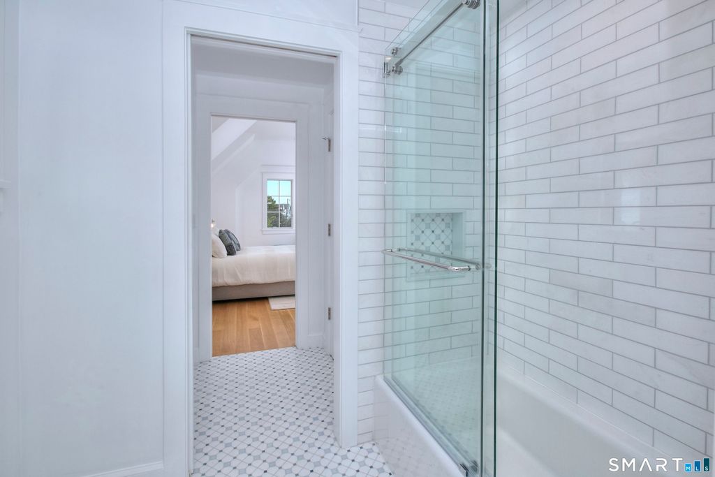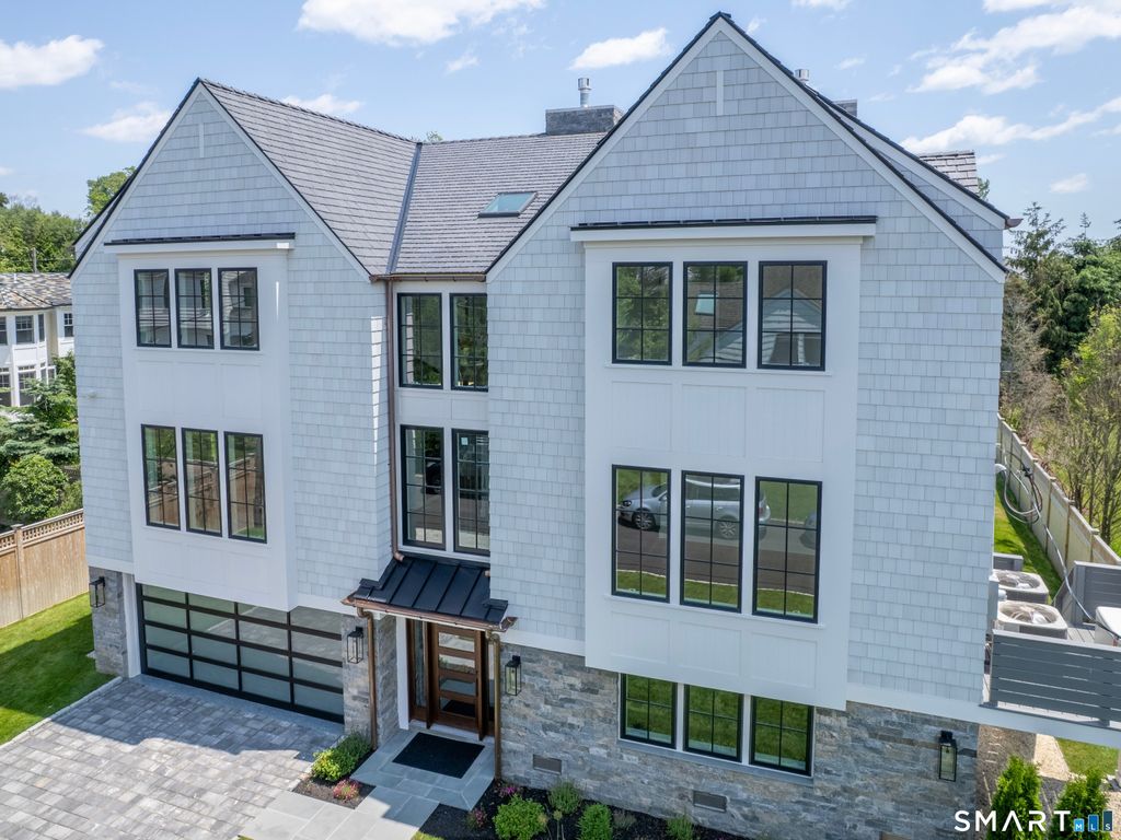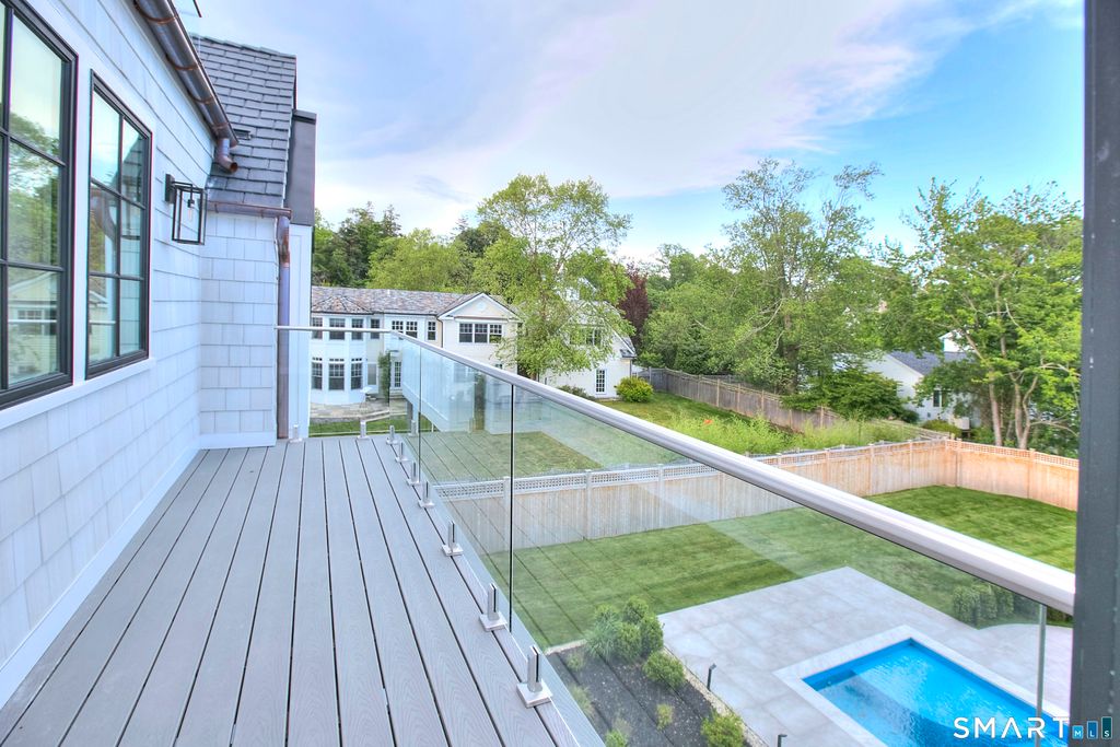 Located on a quiet private lane just two blocks from Compo Beach, this newly built coastal residence at 22 Appletree Trail offers a rare combination of modern craftsmanship, thoughtful design, and effortless beach living in the heart of Westport. Spanning approximately 4,791 sq ft of living space, the home blends timeless architectural elements with refined contemporary finishes. White oak floors, soaring ceilings, and custom Italian cabinetry create a warm and sophisticated interior. The chef's kitchen features L'Ottocento cabinetry, Thermador appliances, and Compac Quartz surfaces, complemented by a fully equipped butler's pantry with a second dishwasher and wine refrigeration. An open-concept family room with a sleek linear gas fireplace flows seamlessly to the covered outdoor terrace overlooking the heated pool and landscaped grounds-perfect for both quiet evenings and entertaining. Upstairs, vaulted bedrooms include fully furnished custom closets. A sun-filled lounge opens to a private rooftop deck with a gas fireplace and seasonal views of Long Island Sound. The primary suite offers a private terrace, dual walk-in closets with custom Italian millwork, and a spa-inspired bath designed for relaxation. Set moments from the shoreline while offering easy access to Manhattan via train, this newly completed residence presents a rare opportunity to enjoy modern coastal living in one of Westport's most desirable neighborhoods.