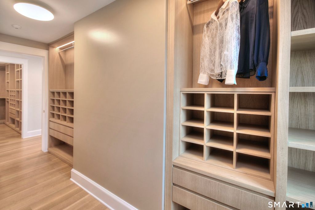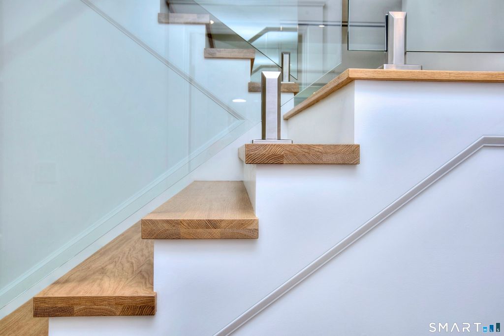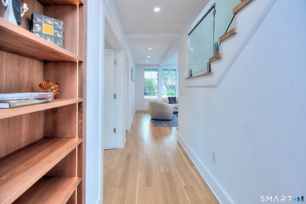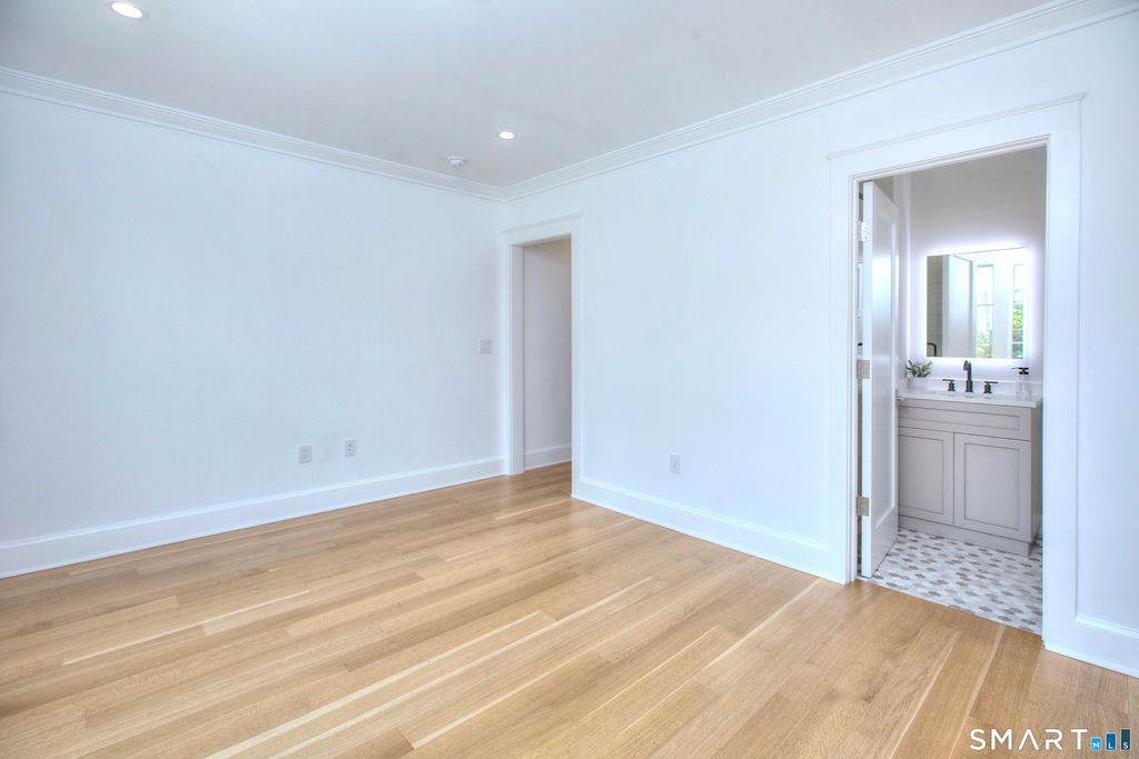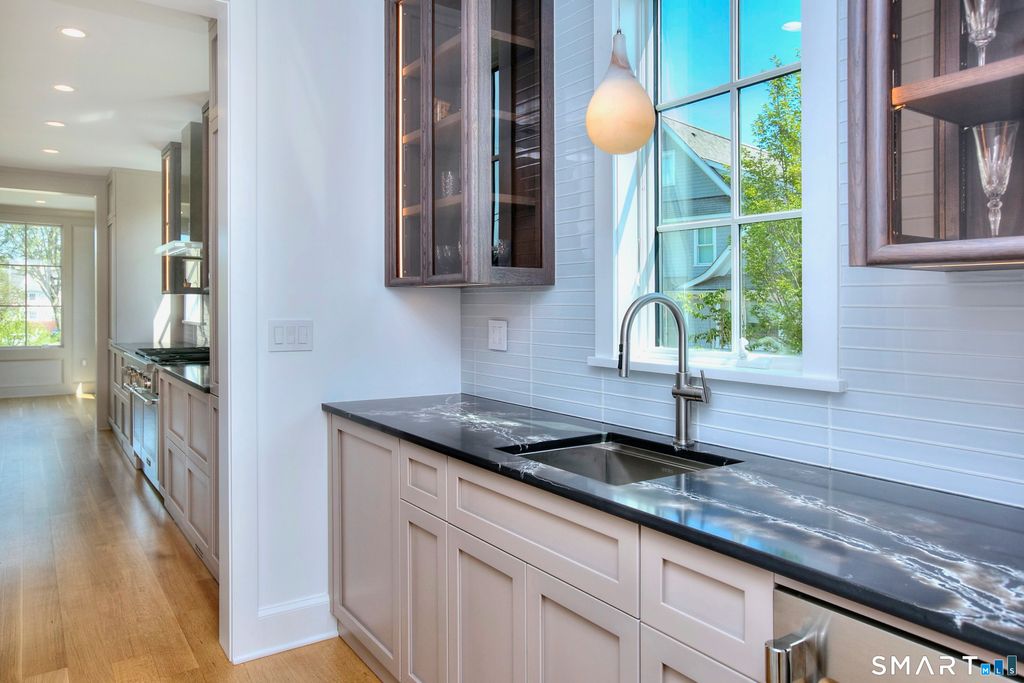 Located on a quiet private lane just two blocks from Compo Beach, this newly built coastal residence at 22 Appletree Trail offers a rare combination of modern craftsmanship, thoughtful design, and effortless beach living in the heart of Westport. Spanning approximately 4,791 sq ft of living space, the home blends timeless architectural elements with refined contemporary finishes. White oak floors, soaring ceilings, and custom Italian cabinetry create a warm and sophisticated interior. The chef's kitchen features L'Ottocento cabinetry, Thermador appliances, and Compac Quartz surfaces, complemented by a fully equipped butler's pantry with a second dishwasher and wine refrigeration. An open-concept family room with a sleek linear gas fireplace flows seamlessly to the covered outdoor terrace overlooking the heated pool and landscaped grounds-perfect for both quiet evenings and entertaining. Upstairs, vaulted bedrooms include fully furnished custom closets. A sun-filled lounge opens to a private rooftop deck with a gas fireplace and seasonal views of Long Island Sound. The primary suite offers a private terrace, dual walk-in closets with custom Italian millwork, and a spa-inspired bath designed for relaxation. Set moments from the shoreline while offering easy access to Manhattan via train, this newly completed residence presents a rare opportunity to enjoy modern coastal living in one of Westport's most desirable neighborhoods.