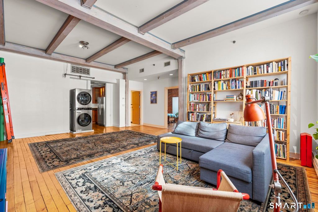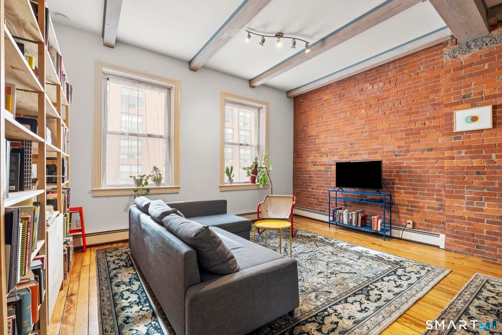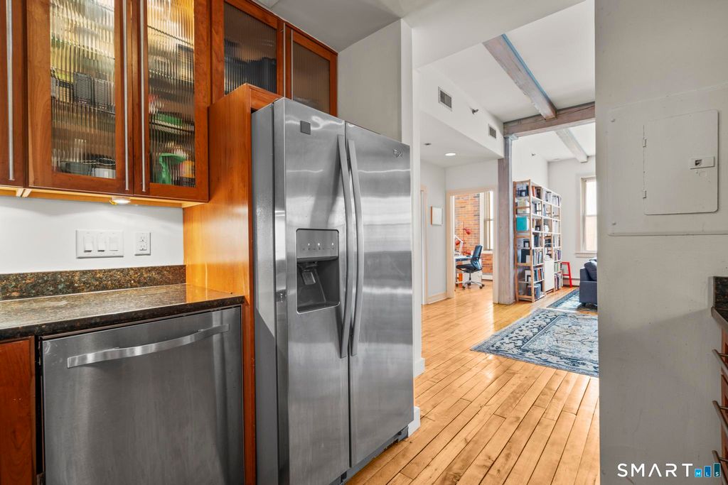 Style, character, and downtown energy, this loft-style condo in the heart of New Haven delivers all three. Exposed brick walls, original hardwood floors, and soaring wood-beamed ceilings give the space a warmth and authenticity you simply can't replicate, while oversized windows flood the open living and dining area with the kind of natural light that makes every hour of the day feel good. The kitchen has been tastefully designed with stainless steel appliances, a Viking stove, cherry cabinets with glass faces, and granite countertops. Equal parts beautiful and functional. High ceilings and a generous open layout make this space as perfect for hosting as it is for simply coming home. The primary suite offers a true retreat with ample closet space and an en-suite bath. The second bedroom has its own charm, with exposed brick, and two large closets. A second full bath with tub/shower combination rounds out the living space beautifully. Energy-efficient gas heat, central air, and one off street parking space are all included. Tucked into a quiet corner of Downtown in the 9th Square district. Vibrant, walkable, and surprisingly serene Downtown living. Just a half mile to YNHH, Union Station and steps to New Haven's finest restaurants, cafes, grocery and boutiques!