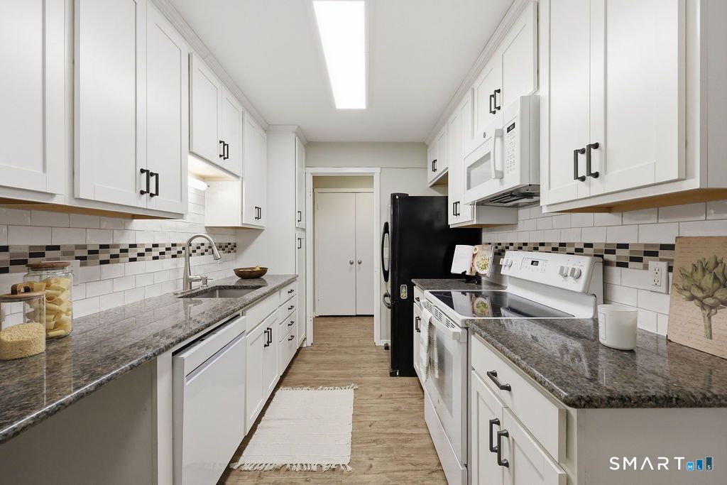 Discover easy, comfortable living just minutes from the heart of Simsbury. This beautifully updated ranch style condo offers the perfect blend of style and simplicity-all on one level. Step inside to a bright, freshly painted living space featuring an open layout, recessed lighting, a cozy fireplace, and two sliders leading to a spacious deck overlooking a peaceful stream. It's an ideal spot to unwind or entertain. The updated kitchen shines with granite countertops, modern cabinetry, a subway tile backsplash, deep sink, and stainless appliances. Both bedrooms offer new carpeting, with the primary suite featuring generous closet space and a private full bath. A second full bath includes a tub for added convenience. Enjoy year round comfort with a newer heat pump and multi-split system, plus the ease of in unit laundry with a brand new washer. Vinyl flooring throughout the main areas keeps maintenance simple. Residents also have access to a beautifully maintained inground pool and clubhouse-perfect for relaxing weekends. A private garage and additional parking add to the convenience. All of this is located just moments from downtown Simsbury, the library, Rails to Trails bike path, Simsbury Meadows Performing Arts Center, The Coffee Spot, shops, restaurants, and more. If you're looking for a peaceful, low maintenance home with modern updates and unbeatable convenience, this condo delivers.