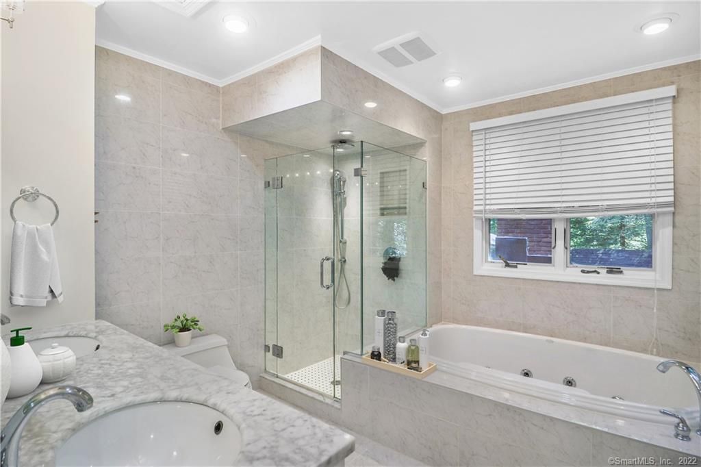 Pristine Mediterranean Colonial nestled in quiet North Stamford with 4 bedrooms and 2.5 bathrooms available! With more windows than you'd like to count to illuminate the updates around the home and being set on over 2 acres, it is a sight to see. Beautifully remodeled Kitchen offers Breakfast Bar, top of the line Stainless Steel Appliances, cabinets and pantry space galore. Induction CookTop works LIKE cooking on GAS!! Spacious Laundry room with built-in cabinets. Huge Primary Bedroom with tons of closet space and dressing area with a panoramic window for serene views. 4th bedroom is converted into an Office with gorgeous views, high ceilings and dark wood beams. This house has so much to offer, top quality finishes and high end gorgeous remodeled Marble Primary Bathroom with shower and Jacuzzi. Den with Fireplace, Wet Bar and French doors opens up to a huge fully renovated Deck providing for family and friends' entertainment. Wine Cellar for the finest taste. New hardwood floors throughout and existing floor refinished. Great commuter location convenient to everything Stamford has to offer including the new Scofieldtown Park, schools, shopping, restaurants, The Merritt Parkway, Metro North Train and Downtown Stamford.