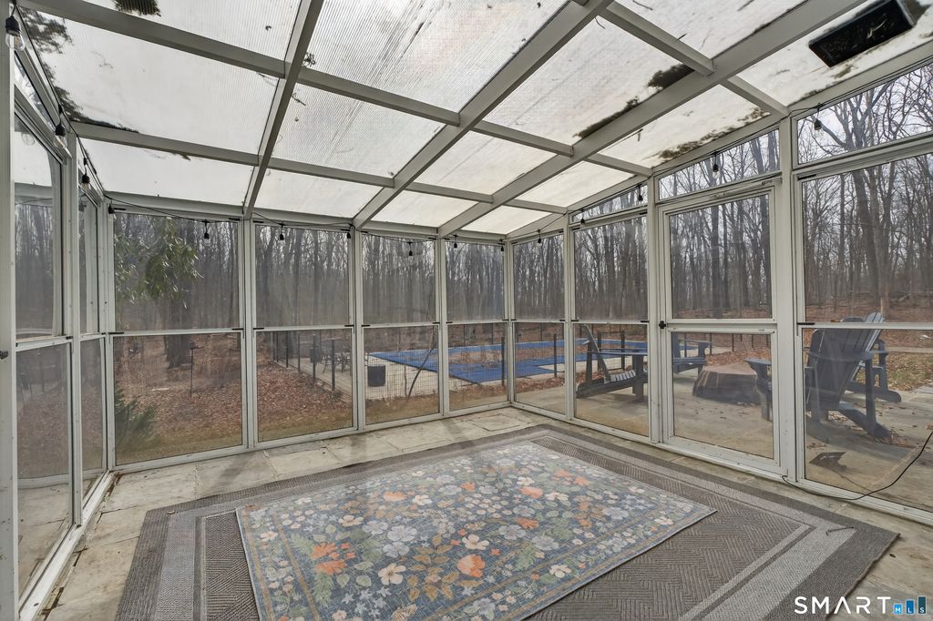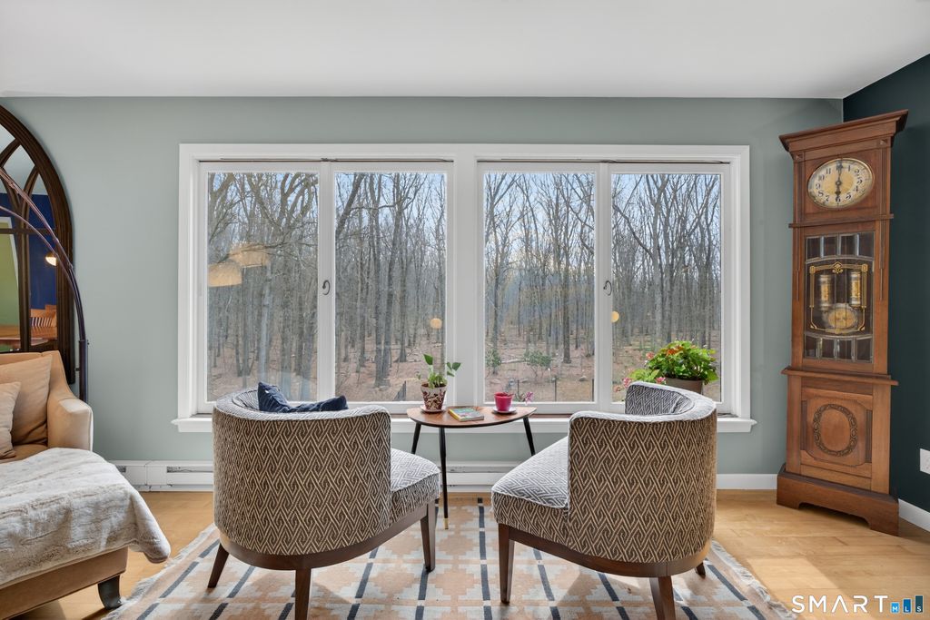 Privately set on 3.4 acres at the end of a cul-de-sac in Hamden's Mount Carmel neighborhood, this contemporary residence offers over 4,000 square feet of living space defined by mid-century modern design. Built in 1968, the home features 5 bedrooms and 3 full baths along with 1 half bath, arranged across a spacious layout with multiple living areas. The main level includes a living and dining area highlighted by expansive windows that bring in natural light and overlook the surrounding grounds. The kitchen connects to the main living spaces, creating a central gathering area. A library with built-in shelving, additional bedrooms, and baths complete the upper level. A distinctive staircase leads to a finished walk-out lower level featuring a large great room with fireplace and wet bar, additional bedrooms, bathrooms, laundry area, and access to a sunroom and outdoor spaces. Exterior features include a screened porch, patio, and pool, set within a wooded setting that offers privacy and open space. Located near local amenities, universities, and major highways, the property is positioned within the Mount Carmel section of New Haven County.