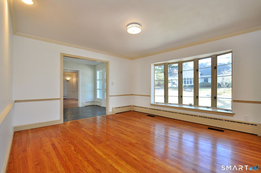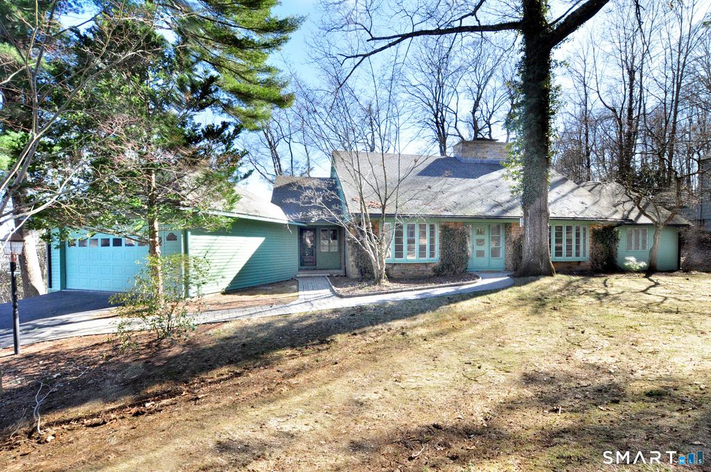 Rare Find!! First floor primary bedroom suite, with full bath and generous walk-in closet. Wonderful sunfilled living room with floor-to-ceiling windows, wide-board stunning new oak floor and a lovely field stone fireplace with raised hearth. Additionally, there is a first floor spacious family room with built-ins, chair-rail molding, bay window, parquet floors and brick fireplace with raised hearth. The formal dining room has a bay window, chair-rail moldings and two cabinets that provide plenty of storage. The large entryway to the home has blue stone flooring with ample closets and sidelites flanking a classic mid-century front door. The eat-in kitchen has birch cabinets, Corian counters, tile back spash, undermounted sink and tile floor, and the eat-in area has views out to patio and lightly wooded lawn. The first floor laundry is kitchen ajacent. A heated sunroom with catherdral ceiling and skylight is accessed from kitchen or living room. The floor plan is perfect for entertaining. Two very large bedrooms and a full bath are located on the second floor. Including tons of storage space and closets. The home is very conveniently located, mere minutes to the reservoir, to hiking and bike trails, Cornerstone pool, tennis, indoor skating rink, and multiple golf courses and fine dining in West Hartford town center, as well as just a few miles to Bishops corner with multiple shops and varied grocery stores.