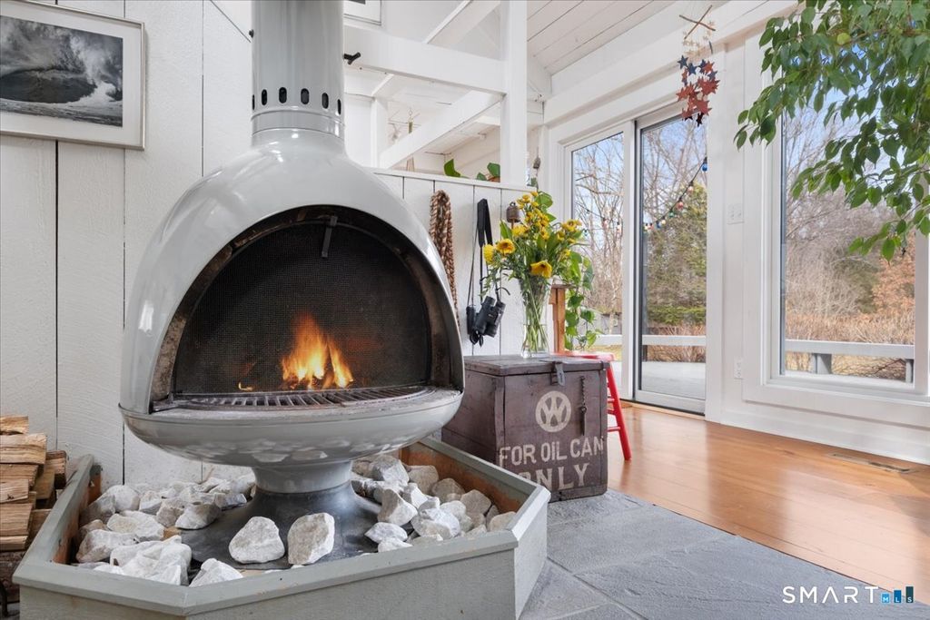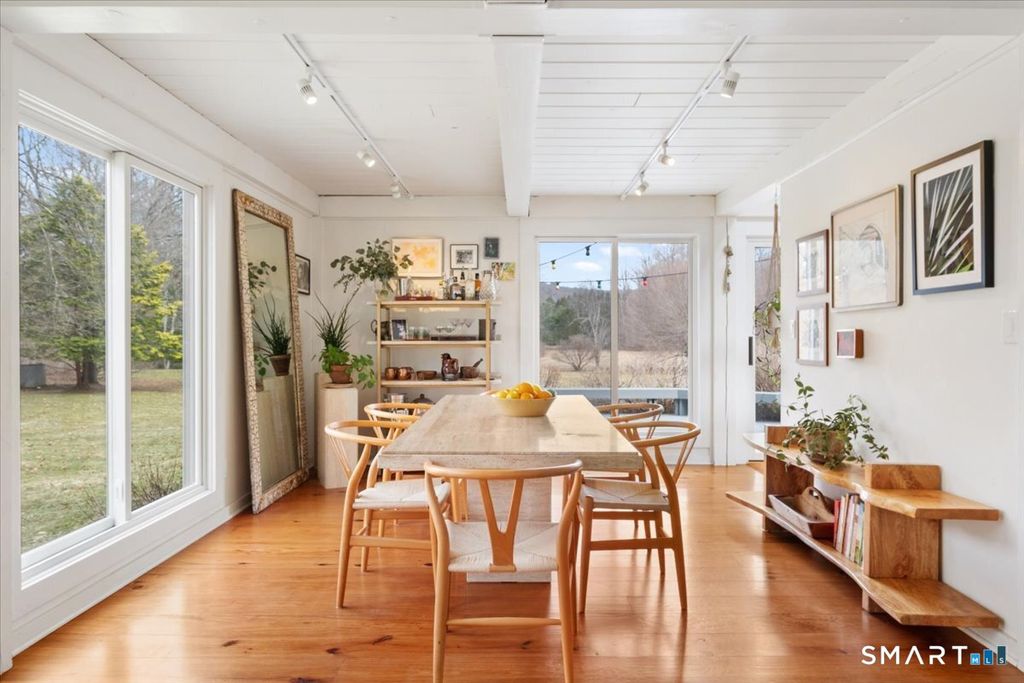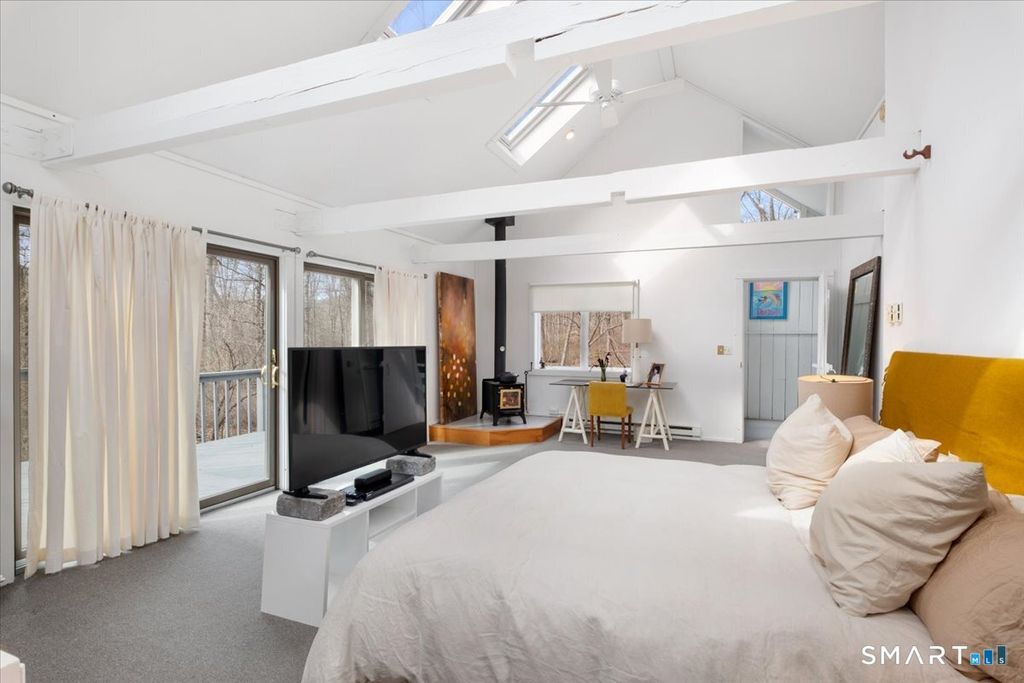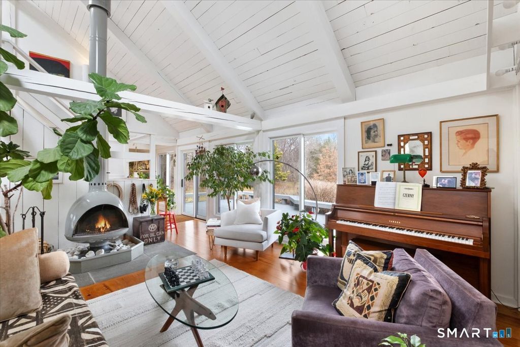 Welcome to 7 Anderson Hill Rd - a serene retreat set on over 7 acres of beautifully landscaped grounds, featuring specimen trees and vibrant perennial gardens that create a true sense of peace and privacy. A charming stone gravel driveway leads you to this stunning contemporary home offering 3 bedrooms, 2.5 baths, and a detached, heated 2-car garage. Inside, the dramatic two-story living room makes an immediate impression with its soaring ceilings, freestanding fireplace, and expansive walls of windows that flood the space with natural light. The cozy den provides the perfect spot to relax with a book or enjoy your favorite shows. The open-concept kitchen flows seamlessly into the dining and living areas, making entertaining effortless. It features granite countertops, slate floors, a double wall oven, electric cooktop, dishwasher, and abundant windows that add warmth and character. The dining room, with its wide-plank hardwood floors and wall of windows, is ideal for hosting or simply enjoying your morning coffee while overlooking the scenic property. Upstairs, you'll find two generously sized bedrooms, an oversized walk-in closet, and a shared full bath. The private primary suite is thoughtfully set apart, offering its own fireplace, a large walk-in closet, full bath, and a tranquil private deck nestled among the trees-perfect for starting your day in nature. The finished basement provides valuable additional living space and includes a California walk-in closet.