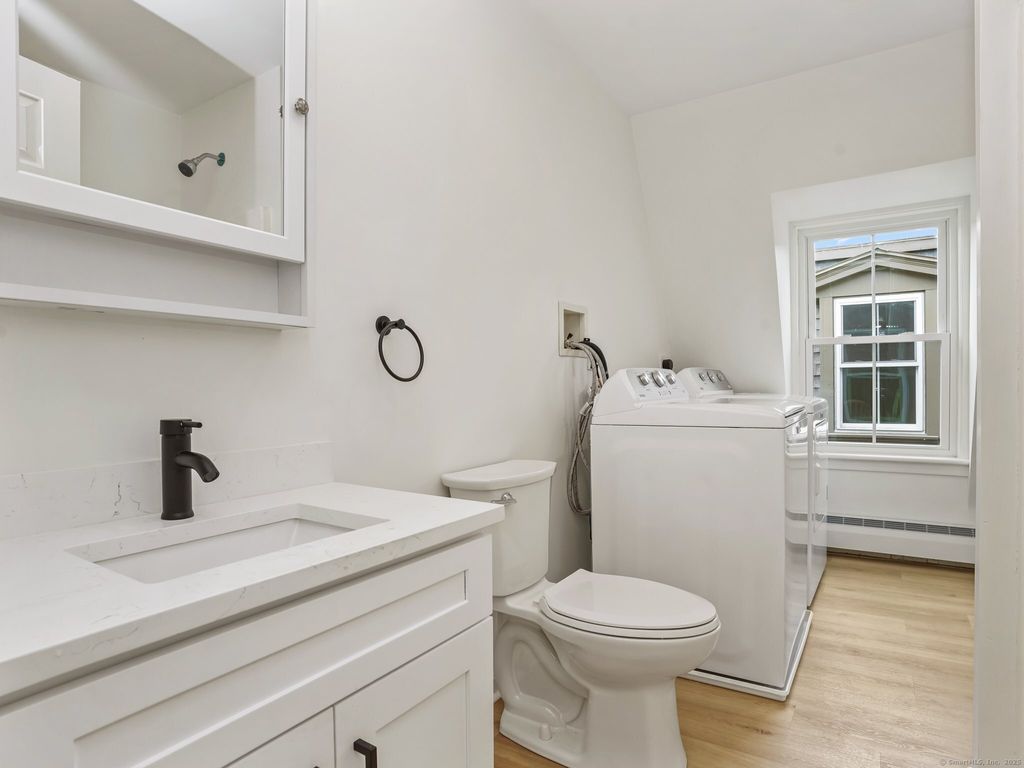 Fully renovated 2 BR 1 BA apartment. Living room opens to an eat-in kitchen. New kitchen with quartz countertops and stainless steel appliances. Newly renovated bathroom with shower/tub. New floors throughout the apartment. Brand new washer and dryer in unit. 1 outdoor assigned parking spot. Located minutes from Stamford Train station, downtown Stamford, and tons of shops/restaurants. Unit is a mirror image from the photos with white cabinets