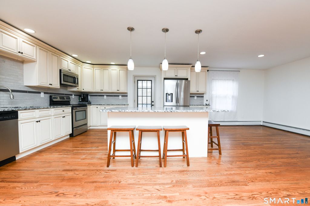 Welcome to 473 Westfield Street - a beautifully maintained 3-bedroom, 2-bath ranch-style home featuring a desirable open floor plan that seamlessly connects the kitchen and living area. The kitchen impresses with stainless steel appliances, granite countertops, abundant cabinetry, and a center island offering extra storage and workspace. Sunlight pours through the large colonial-style windows, illuminating the hardwood floors and freshly painted walls and trim. Each bedroom offers generous closet space, while the primary suite includes a stylish modern ensuite bathroom. The large unfinished basement provides ample storage and includes laundry facilities. Additional features include central air, baseboard heating, and solar panels for energy efficiency. Step outside onto the spacious back deck, which overlooks a massive backyard bordered by a charming stream-the perfect setting for outdoor relaxation. Ample parking is available at the front of the home. Experience comfortable living in a serene setting. Conveniently located close to shopping, restaurants and highways.