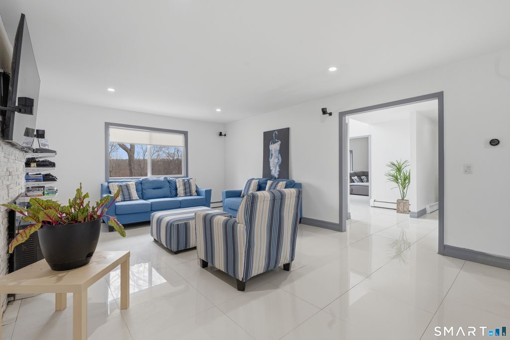 Welcome to 16 Raquel Drive, a beautifully updated contemporary home tucked away at the end of a quiet cul-de-sac in the highly desirable Stadley Rough neighborhood; just two streets from Candlewood Lake. This 3-bed, 2.5-bath home offers 1,858 sq ft of exceptional living space, highlighted by a fully remodeled first floor with elegant tile flooring throughout. The sun-filled living room features a dramatic vaulted ceiling and oversized window, seamlessly flowing into the dining area with continued vaulted ceilings, a skylight, and double doors leading to the expansive back deck. The updated kitchen is a standout, complete with quartz countertops, brand new stainless steel appliances, and a large island. The main level also includes a stylishly remodeled half bath and a spacious den featuring a pellet stove, stunning tile-backed fireplace hearth, large windows, and direct access to the deck-creating the perfect space to relax or host guests. Upstairs, you'll find two generously sized bedrooms, a full bath, and a versatile loft area ideal for a home office, playroom, or guest space. The primary suite offers vaulted ceilings and a fully remodeled ensuite bath with a separate shower and soaking tub for a true retreat experience. Outside, enjoy a massive wraparound deck overlooking a refreshing pool, offering privacy and a perfect setting for summer entertaining. Additional highlights include a spacious two-car garage and a home set well back from the road for tranquili