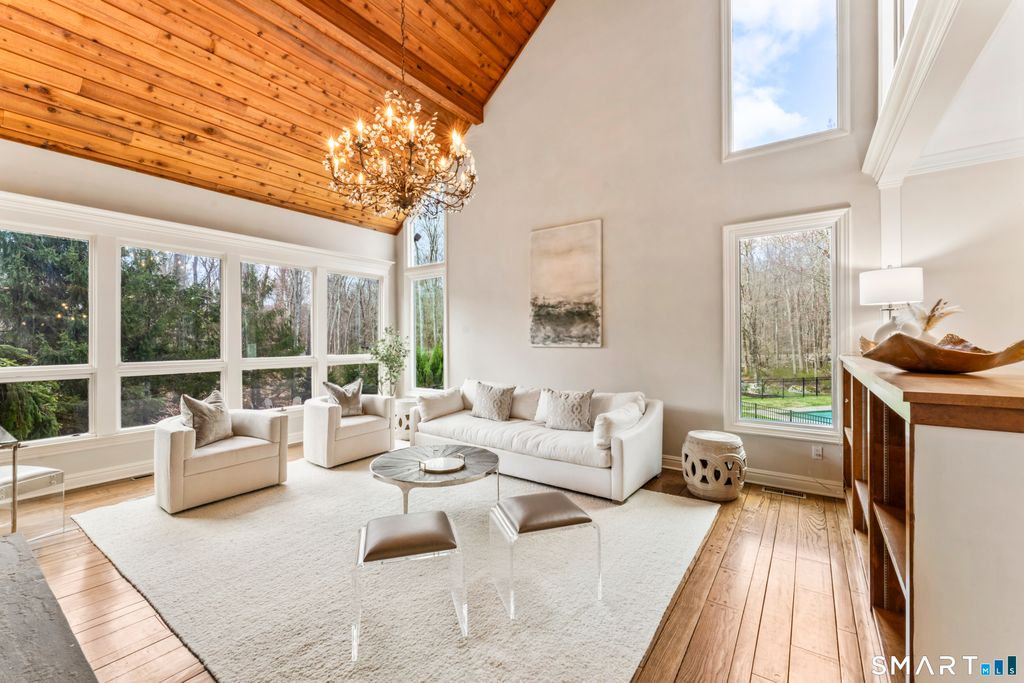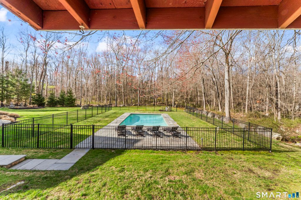 CONTEMPORARY RETREAT IN LOWER WESTON. Set on over two private acres in coveted Weston, this timeless Contemporary offers beautifully proportioned, light-filled living spaces designed for both relaxed everyday living and elegant entertaining. A gracious foyer welcomes you into the home, where a dramatic sunken living room with soaring vaulted ceilings and a striking stone fireplace creates an inviting gathering space filled with natural light. The dining room and chef's kitchen line the rear of the home, each opening through French doors to the expansive deck-creating a seamless flow for indoor-outdoor entertaining and gatherings overlooking the private backyard and pool. Privately tucked away, the family room features a gas fireplace and connects to a charming sunroom, offering a comfortable retreat. The upper level offers four generously sized bedrooms and well-appointed baths. The serene primary suite serves as a peaceful sanctuary, featuring an oversized bedroom, private bath, and walk-in closet. Additional highlights include a finished basement with ample storage, generator, invisible fence, security system, fire pit and pool shed. Nestled in a picturesque lower Weston neighborhood, this property offers exceptional privacy and natural beauty. With top-rated schools and convenient train access to NYC, the home offers the perfect balance of country living and everyday accessibility.