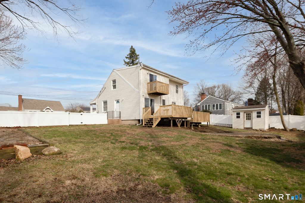 Charming, clean, and ready to move in Cape-style home (fully dormered in back) located on a quiet dead-end street with an oversized driveway offering ample off-street parking. Features a semi-open floor plan with hardwood floors, spacious living room, formal dining room, first-floor bedroom and full bath. The kitchen includes granite countertops, stainless steel appliances, breakfast bar, and plenty of cabinet and counter space. Upstairs offers a large primary bedroom suite with private balcony, generous closet space, and recessed lighting, and full bath with skylight. 3rd bedroom also on the upper level. Fully finished basement provides extra living space, ideal for a family room, and additional office space, along with separate laundry room and ample storage. Enjoy the oversized fenced-in backyard with a large deck, fire pit, and shed-perfect for entertaining. Conveniently located near schools, shopping, dining, and major commuter routes.