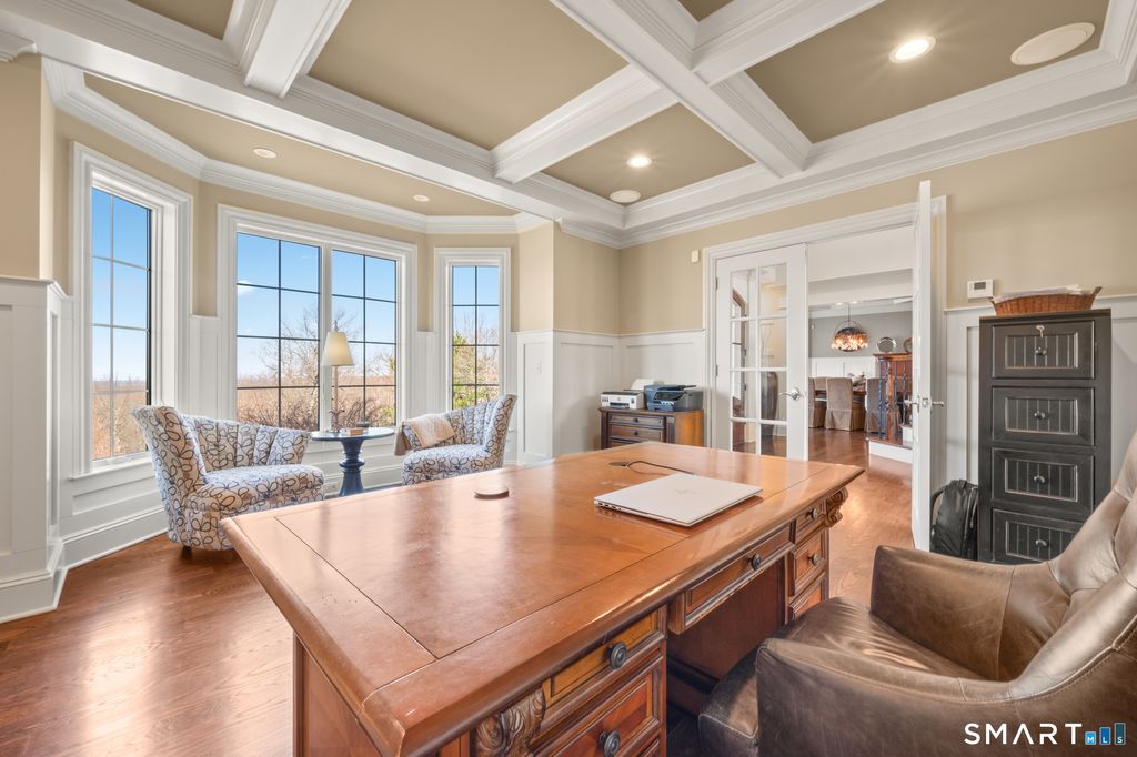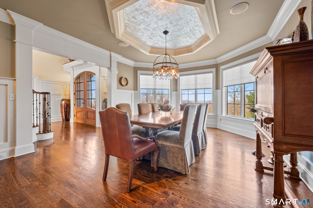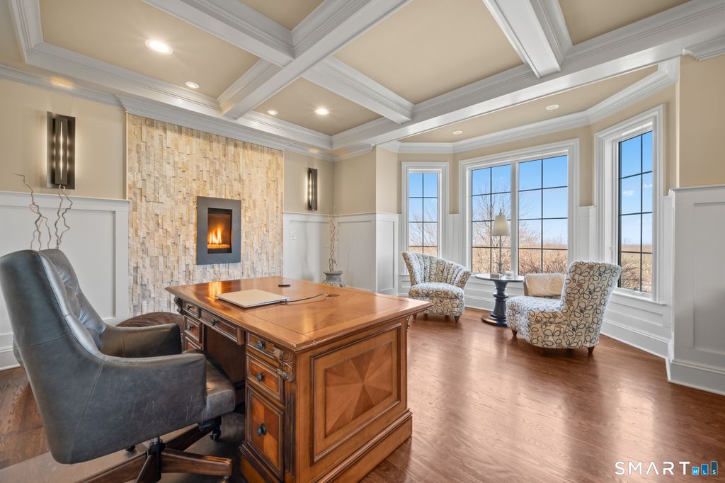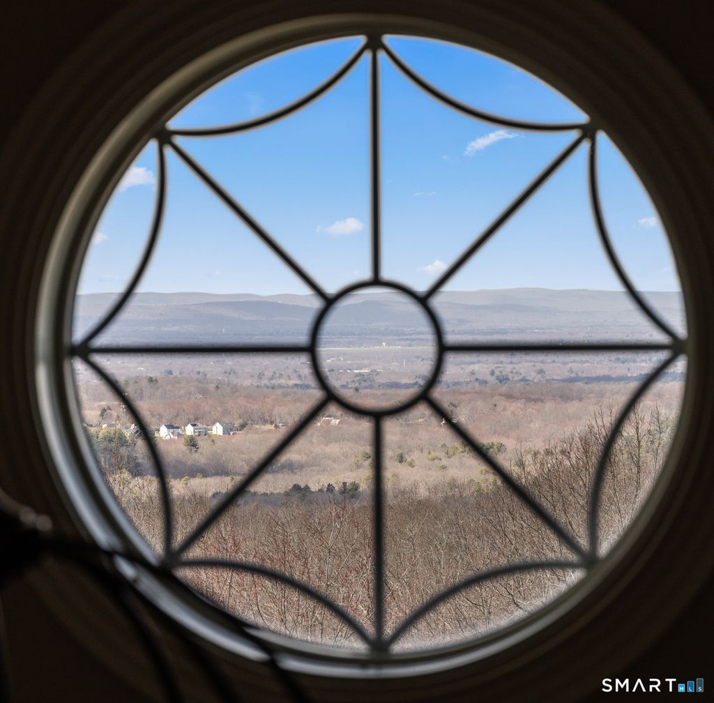 Custom Catarino-built French Country residence, located on a cul-de-sac in an enclave of fine homes, seamlessly blends rustic charm with modern elegance. Situated high on a knoll to capture unparalleled views of Hartford skyline and the ridges beyond, this 5022 sq ft home, built in 2016, offers a multitude of warm, welcoming spaces, each designed to perfection. The Kitchen and Great Room create an immediate impact - literally take your breath away - with extraordinary architectural design that offer both scale and comfort. A stove hood crafted from natural stone anchors the space, complemented by beams of reclaimed wood overhead, a massive center island with seating for six, and a windowed sitting alcove that calls you to relax with a morning coffee. In the two-story Great Room, oversized custom Andersen windows flood the space with natural light, while a stone gas fireplace adds warmth and a striking focal point. Vibrant sunsets transform the dining room many evenings, casting the space in warm light and color. Working from home is a pleasure in the dedicated office with bump-out bay windows, coffered ceiling, and gas fireplace. A fabulous first floor flex space with attached accessible bath is perfect for guests, playroom or library. On the second level is a magnificent primary bedroom with stunning barrel ceiling, sitting room, French doors opening to sweeping vistas, and a sumptuous ensuite bath with soaking tub, heated floors, and deluxe shower. Three additional