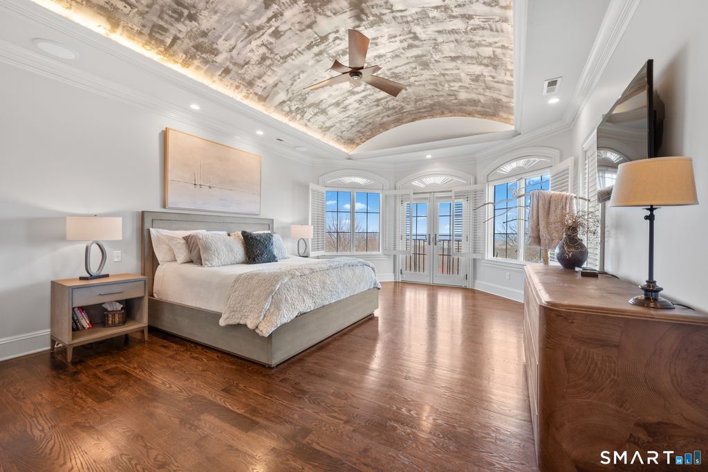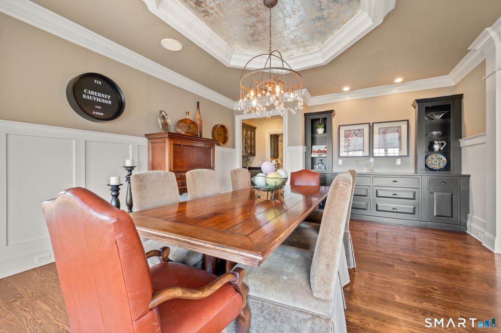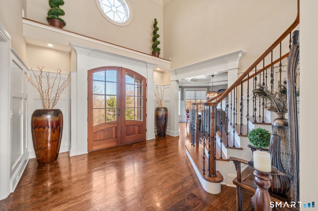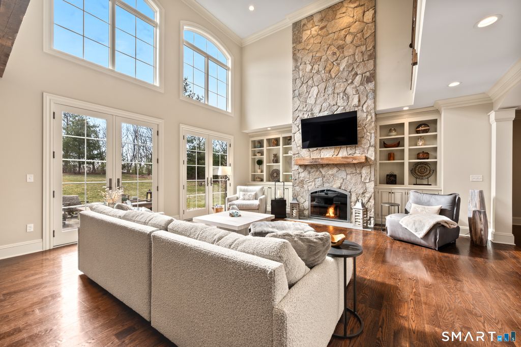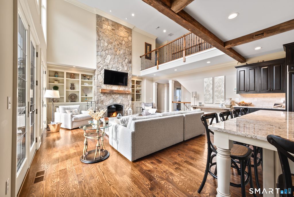 Custom Catarino-built French Country residence, located on a cul-de-sac in an enclave of fine homes, seamlessly blends rustic charm with modern elegance. Situated high on a knoll to capture unparalleled views of Hartford skyline and the ridges beyond, this 5022 sq ft home, built in 2016, offers a multitude of warm, welcoming spaces, each designed to perfection. The Kitchen and Great Room create an immediate impact - literally take your breath away - with extraordinary architectural design that offer both scale and comfort. A stove hood crafted from natural stone anchors the space, complemented by beams of reclaimed wood overhead, a massive center island with seating for six, and a windowed sitting alcove that calls you to relax with a morning coffee. In the two-story Great Room, oversized custom Andersen windows flood the space with natural light, while a stone gas fireplace adds warmth and a striking focal point. Vibrant sunsets transform the dining room many evenings, casting the space in warm light and color. Working from home is a pleasure in the dedicated office with bump-out bay windows, coffered ceiling, and gas fireplace. A fabulous first floor flex space with attached accessible bath is perfect for guests, playroom or library. On the second level is a magnificent primary bedroom with stunning barrel ceiling, sitting room, French doors opening to sweeping vistas, and a sumptuous ensuite bath with soaking tub, heated floors, and deluxe shower. Three additional