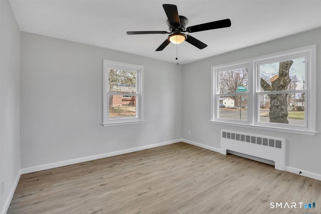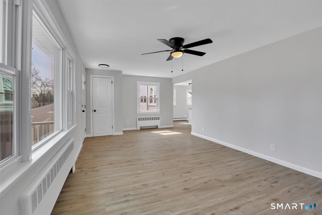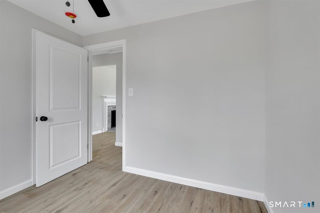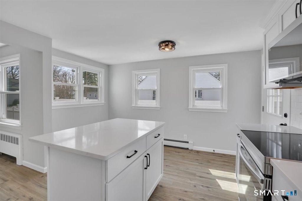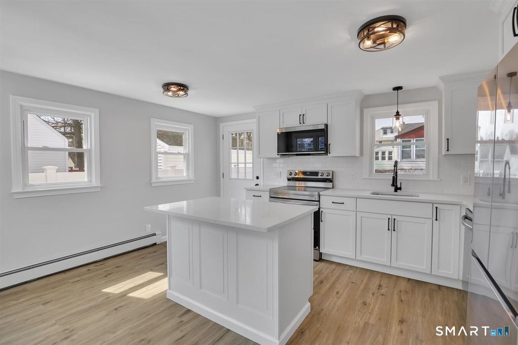 Beautifully remodeled and move-in ready, this charming 3-bedroom, 1-bath ranch offers the perfect blend of modern updates and everyday comfort. Step inside to find stylish vinyl plank flooring flowing seamlessly throughout, complemented by abundant natural light and updated finishes. The stunning kitchen features crisp white shaker cabinetry, stainless steel appliances, and a center island with breakfast bar-perfect for casual dining or entertaining-opening directly into a warm and inviting living room highlighted by a striking stacked stone fireplace. Additional upgrades include a brand-new roof and gutters, low-maintenance vinyl siding, and ceiling fans throughout for added comfort. Efficient baseboard and radiator heat provide reliable warmth during colder months. The full basement offers excellent potential for future expansion-ideal for creating additional living space, a home office, or recreation area. Conveniently located with easy access to bus routes and major highways, this home makes commuting a breeze while keeping you close to local amenities. Don't miss your opportunity to own this beautifully updated home-schedule your private showing today and make it yours!