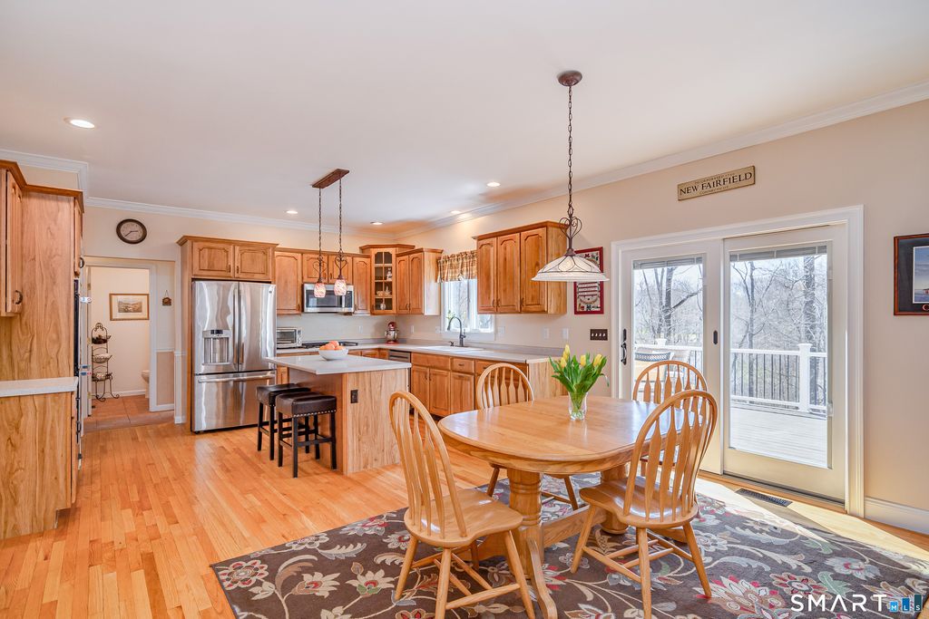 Nestled on the prestigious west side of New Fairfield, just minutes from the NY line, this exceptional home offers over 4,000 sq ft of finished living space. Featuring 4 bedrooms and 3.5 baths, including a fully finished walk-out lower level with full bath, recreation room, and dedicated gym space, this home provides both comfort and versatility. Set on a quiet cul-de-sac, the property boasts a spacious gourmet eat-in kitchen with center island, stainless steel appliances, propane cooking, and seamless flow into the inviting family room with fireplace. A large composite deck off the kitchen overlooks the private backyard adorned with perennial gardens and offers ample space for a future pool. The main level also includes formal living and dining rooms with hardwood floors, a convenient half bath, and a laundry room with utility sink and access to the attached 2.5-car garage with abundant storage. Upstairs, the primary suite features a private full bath and walk-in closet, accompanied by three additional bedrooms, a full hall bath, and a generous playroom ideal for a home office or additional space for overnight guests. The lower level expands the living area with a full bath, recreation room space with sliders to the backyard, gym area, and extensive unfinished storage and mechanical space. A walk-up attic provides additional storage or potential for future expansion. Recent updates (~ 5 years) include 40'x15' composite deck, siding, roof, windows, driveway,
