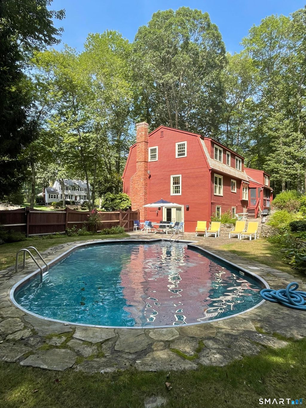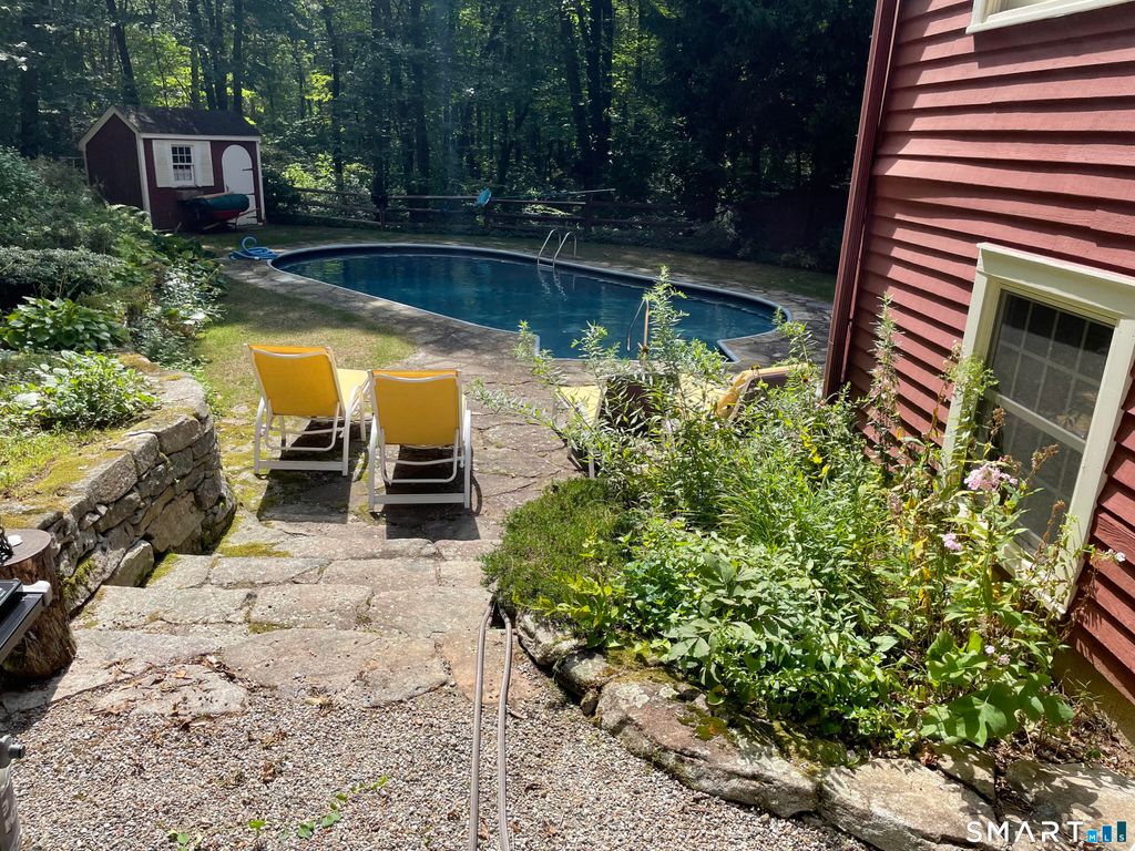 Close to town on desirable Church Lane, this iconic red Colonial with Vermont Burnwood siding makes a striking first impression, beautifully sited on its lot. Offering 2,178 square feet of living space, this 4-bedroom home also features a spacious 730 sq ft heated, finished lower level complete with a fireplace, office, and attractive stone tile flooring that opens to a patio and inviting inground pool-perfect for relaxing or entertaining. The setting of the hill behind the home provides nature and privacy! Inside, the large eat-in kitchen is equipped with newer stainless steel appliances and flows seamlessly into the family room, where a wood-burning fireplace with a classic brick hearth creates a warm, welcoming atmosphere. A screened-in porch offers the ideal spot to enjoy morning coffee or a quiet afternoon breeze. The home also includes a formal dining room and a charming living room with built-in bookshelves and a third fireplace. Thoughtful updates include a newer furnace, Marvin Integrity windows throughout, and beautiful wood garage doors. An inground sprinkler system services both the front and back yards for easy maintenance. Looking for room to grow? A staircase in the garage leads to a large unfinished loft-ready for your vision. Review the floor plans and imagine the possibilities. Come make this special property your home and enjoy all that Madison has to offer, from charming shops and restaurants to a movie theater, independent bookstore, and sandy beaches!