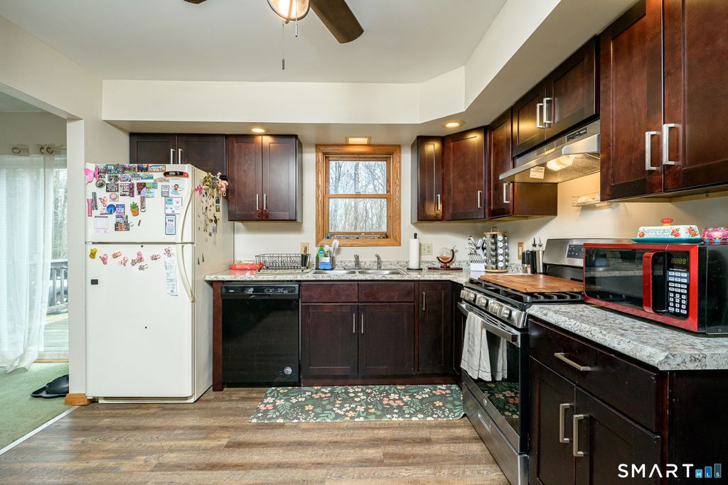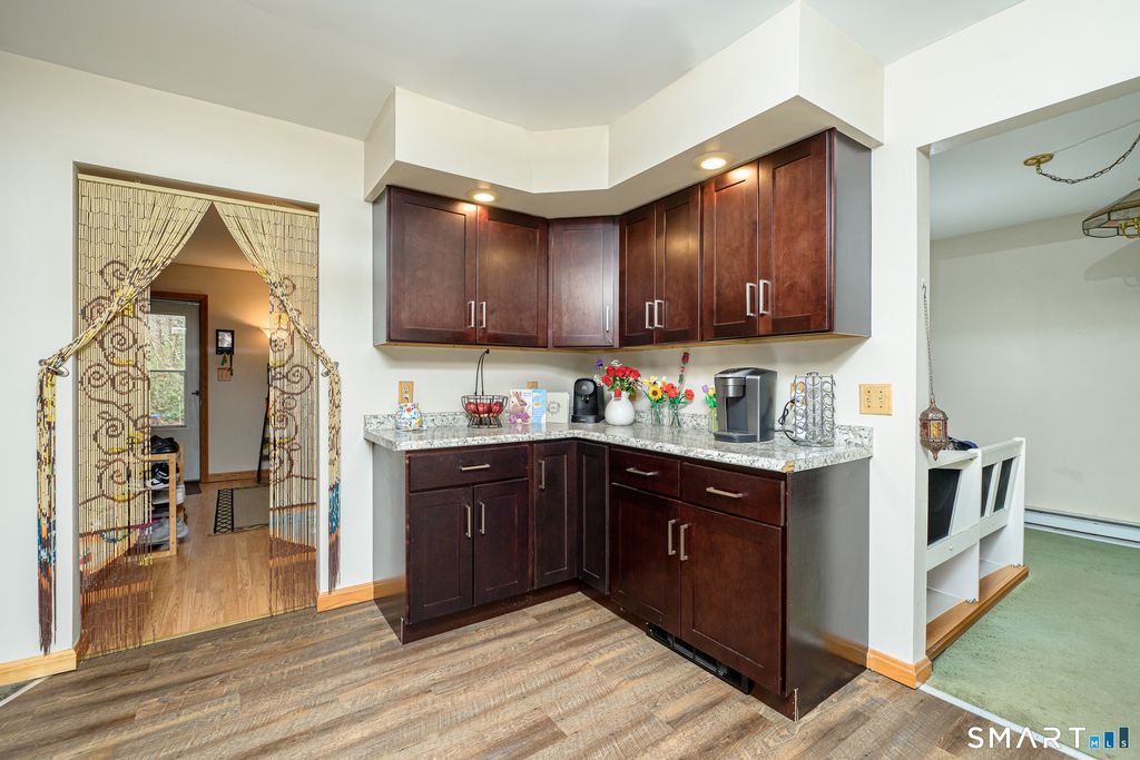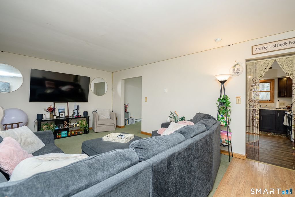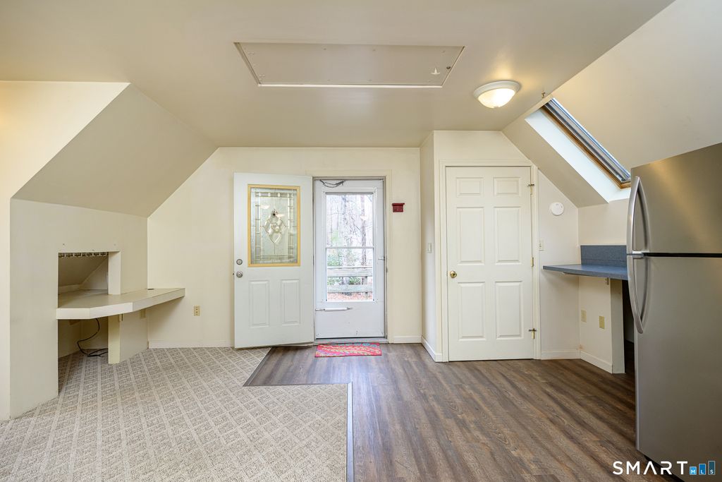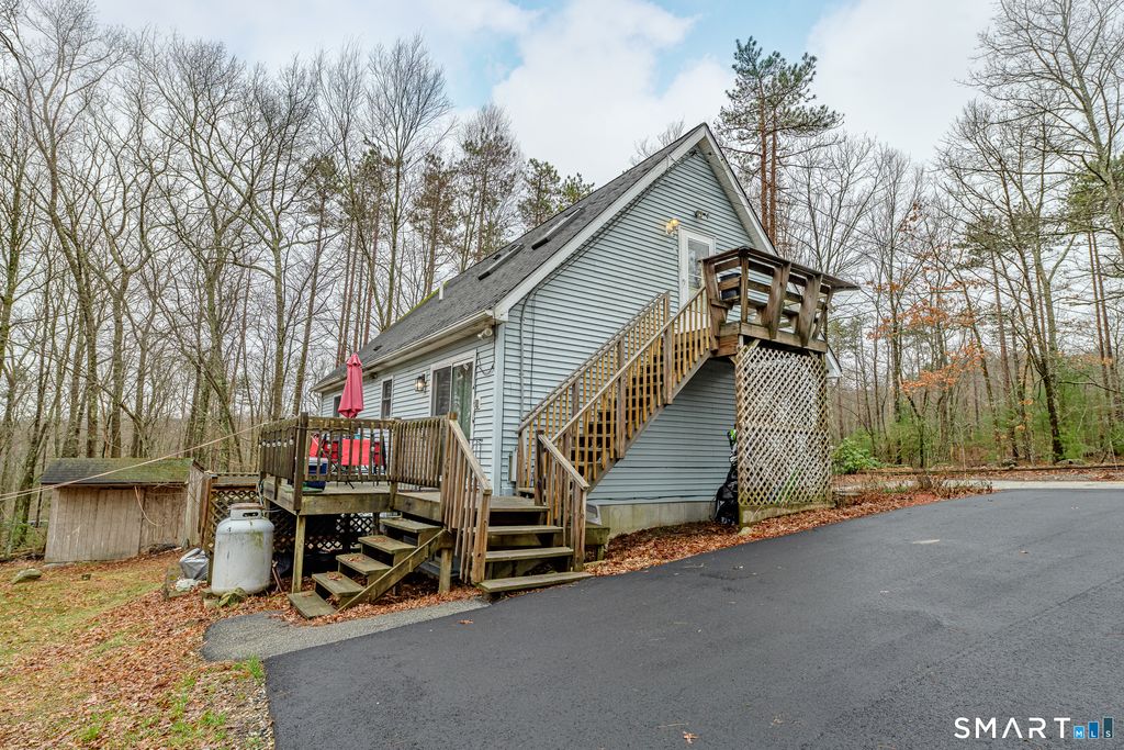Set on a 1.35-acre corner lot on the Pomfret/Eastford line, this versatile property offers flexible living arrangements with separate entrances, ideal for multi-generational living. Built in 1992, the 1,792 sq ft home is currently configured with a 2-bedroom layout on the main level and a 1-bedroom in-law setup on the upper level. The main level features a comfortable living room, a dining area with sliders leading to a deck, and a remodeled kitchen designed for everyday functionality. Upstairs, the in-law space offers an inviting open-concept layout with a remodeled kitchen and breakfast bar, skylights that bring in natural light, and a living room with built-ins. The spacious bedroom includes built-in bookshelves, a vanity, bench seating, and generous closet space. A full bathroom with a jetted tub completes the upper level. Additional highlights include two updated kitchens, off-street parking, a newer well pump, a metal garage, and multiple outdoor spaces to enjoy. The basement provides ample storage with built-ins, and the property also features a shed and a small greenhouse for gardening enthusiasts. A unique opportunity to maximize space, flexibility, and future possibilities in one well-rounded property.