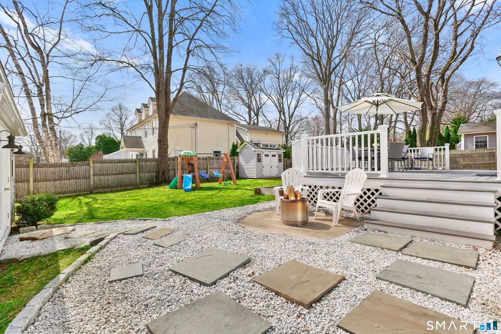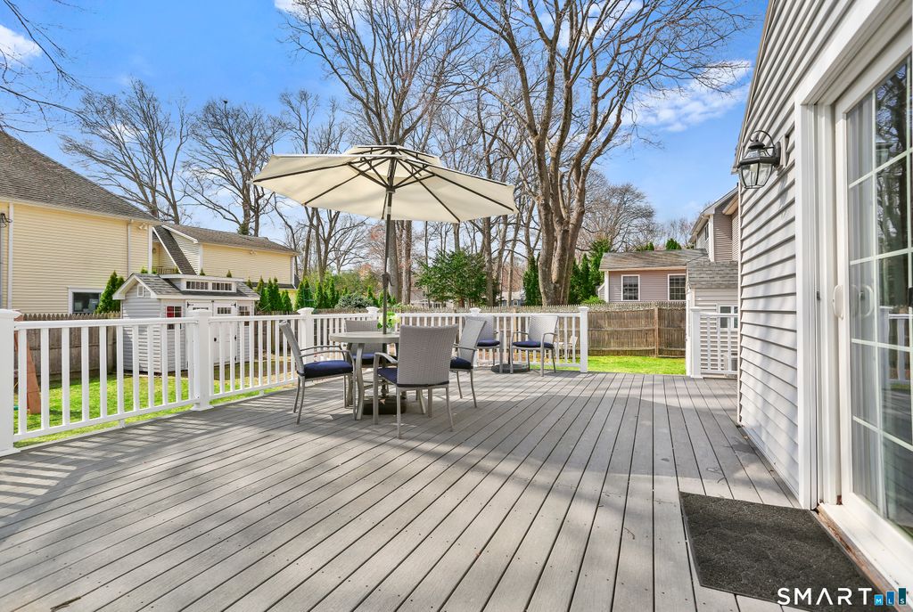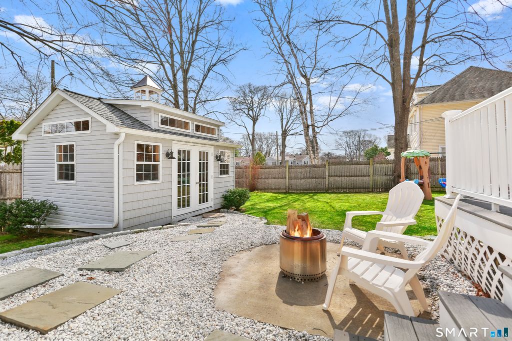 Tucked away on a quiet cul-de-sac in the desirable University area of Fairfield, this move-in-ready Colonial combines thoughtful updates, flexible living space, and an impressive, detached studio. Offering nearly 3,000 square feet of finished living space across three levels, this 4-bedroom, 3.5-bath home features a remodeled eat-in kitchen with new appliances, quartz countertops, farmhouse sink, and wood-burning fireplace with custom mantle. Sliding French doors open to a large deck overlooking the private, fenced yard. The light-filled family room showcases vaulted ceilings and floor-to-ceiling built-ins, while the spacious dining room opens to both the kitchen and family room - perfect for hosting gatherings. A custom mudroom with built-ins provides excellent storage. The flexible layout includes an en-suite bedroom on the main level ideal for guests or in-laws, plus an additional bedroom and updated full bath. Upstairs, the primary suite features a wall of built-ins and a beautifully updated bath, as well as a 4th bedroom and laundry room. The lower level offers additional living space for a recreation room and gym plus a half bath, ample storage, and direct backyard access. A standout feature is the detached studio, currently used as a home office, with vaulted ceilings, natural wood interior, double French doors, and its own heating and cooling system. Ideally located just minutes from downtown, Metro-North train, beaches and parks, this is Fairfield living at its best!