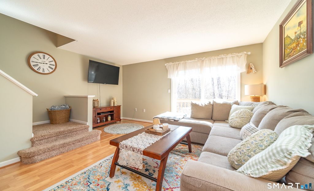 Welcome to 1367 Hanover Ave, 603- a beautifully maintained END UNIT condo offering comfort, convenience, and low-maintenance living in the heart of Meriden! As soon as you walk in the front door you're greeted by the SWEETEST kitchen with great cabinet space and an adorable pass through window to the dining and living area! The large sliding doors to the FRESHLY PAINTED DECK fill the space with natural light, creating a warm and welcoming atmosphere throughout! You'll also love the view from the deck: TREES GALORE.. just peace, and quiet! Upstairs, the spacious bedrooms provide a peaceful retreat with generous closet space and hardwood floors. The full bathroom is spacious and clean! Down in the basement, you'll enjoy a finished WALK OUT space great for an office, man cave, or play room! The laundry/utility room is also in the basement and great for storage! Enjoy the convenience of condo living with 2 assigned parking spots right outside your door and low HOA fees! This complex is DOG FRIENDLY: 1 dog under 70 pounds is allowed! Low HOA fees, NATURAL GAS HEAT, and CENTRAL AIR! Check, check, and check!