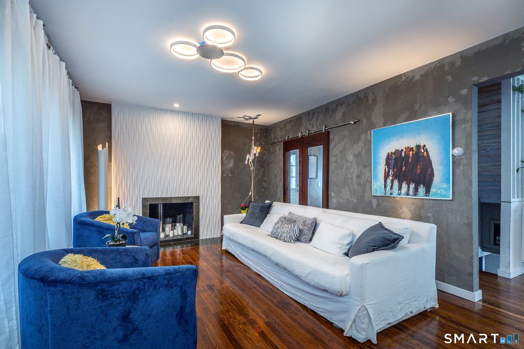 This is a Show-Stopper!!! Presenting 4 Darien Road; an exquisitely reimagined residence that pairs refined modern design with an artful sense of warmth, comfort and sophistication. Beautifully curated interiors, custom finishes, and a seamless blend of texture, light and proportion create a home of exceptional character and style, where every space feels both striking and effortlessly livable. The open floor plan of the main level unfolds with ease, offering a dramatic living room with sleek fireplace feature, an elegant dining area and a designer kitchen appointed with crisp white cabinetry, granite countertops, stainless steel appliances and distinctive tiles. An expansive peninsula with seating anchors the space and encourages gathering, while thoughtful lighting and textural wall treatments set a refined, gallery-like tone. A full bath, dedicated office space and a bonus den provide dedicated living spaces for all the family. Upstairs, the private quarters are anchored by a gracious primary suite reminiscent of a boutique hotel, showcasing a soaring ceiling, richly paneled accent wall and generous walk-in closet space. The adjoining spa-inspired bath features a glass-enclosed shower, deep soaking tub, dual floating vanities and chic monochrome finishes, complemented by 3 additional well-proportioned bedrooms. The lower level expands the home's livability with a stylish lounge area, abundant storage and a thoughtfully designed laundry room with ample work surfaces.