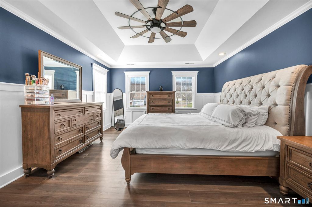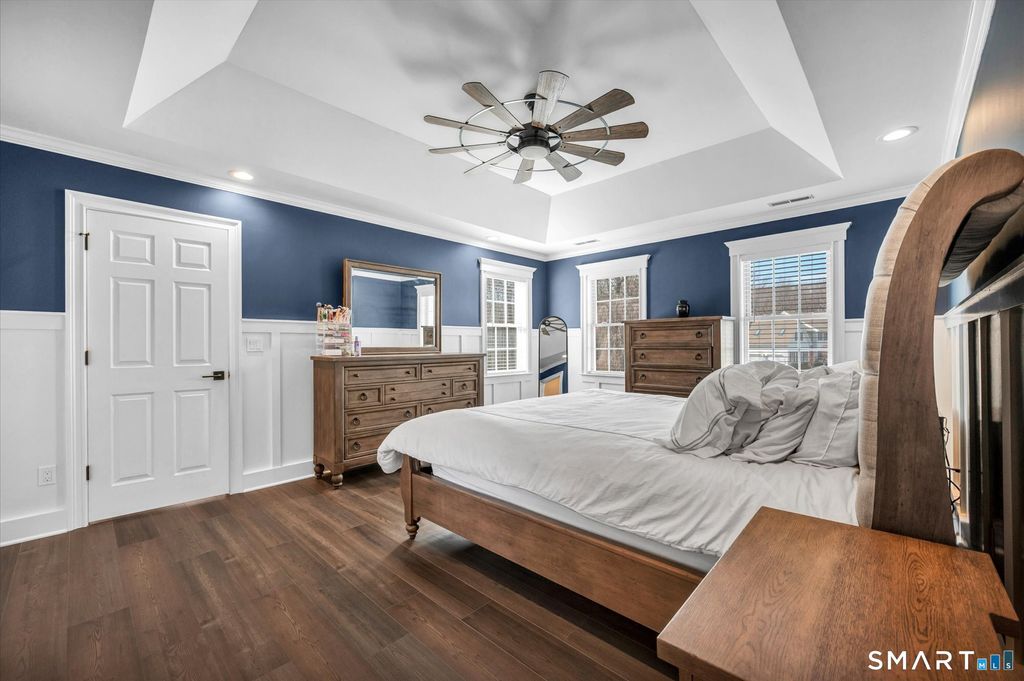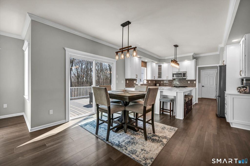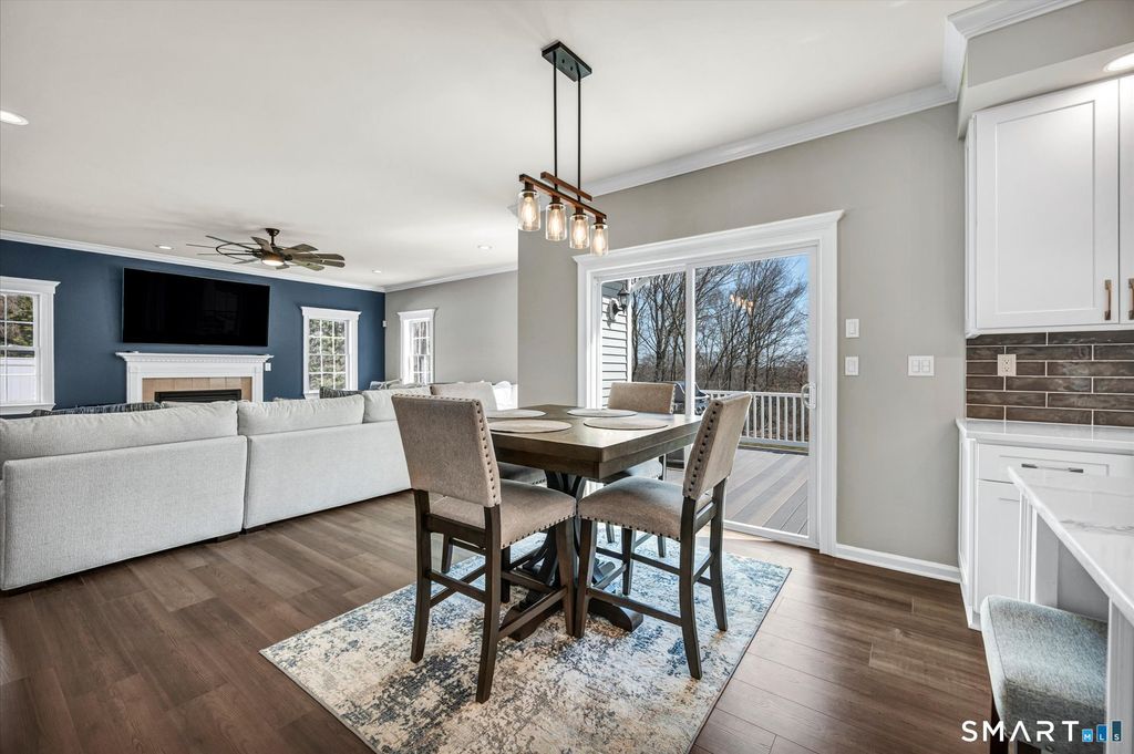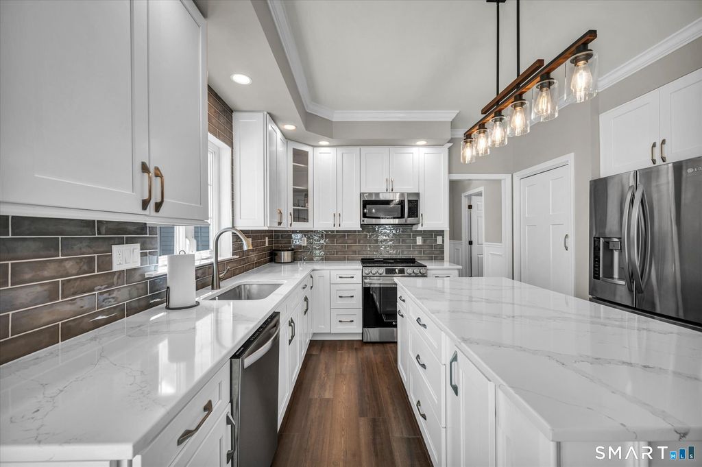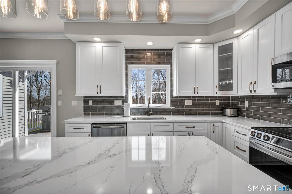 Welcome to Milford Chase, set in the charming coastal town of Milford-"the small city with a big heart." With 17 miles of shoreline, beautiful beaches, and a vibrant downtown, you'll enjoy the perfect blend of coastal living and everyday convenience. This beautifully updated, quality-built Colonial offers over 3,200 sq ft of thoughtfully designed living space and an ideal layout for both everyday living and entertaining. The heart of the home is the stunning kitchen, featuring a large quartz island, updated appliances, and a sun-filled dining area with sliders leading to an oversized deck. The kitchen flows seamlessly into the spacious great room with a gas fireplace, creating a warm and inviting gathering space. A formal dining room and elegant living room add versatility for hosting and holidays. Refined details throughout include crown molding, chair rail, shadow box trim, recessed lighting, and ceiling fans. The expansive primary suite is a true retreat, showcasing tray ceilings, abundant natural light, two walk-in closets, and a beautifully renovated bath with soaking tub and separate shower. A private staircase from the suite to the kitchen adds both charm and convenience. Set at the end of a cul-de-sac on over an acre of level, professionally landscaped property, this home offers exceptional privacy and space. Outdoor living shines with a large deck and an impressive stone patio with walk-out access from the lower level-perfect for entertaining or relaxing.