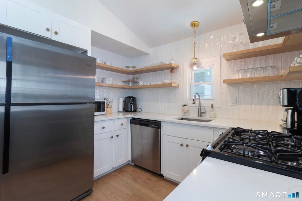 Perfectly suited for investors, owner-occupants, or those seeking a charming vacation retreat, this beautifully maintained home offers the best of shoreline living with water views, close proximity to Silver Sands Beach and steps away from two public beach access walkways. Located just 1.5 miles from downtown, enjoy a quick bike ride to local shops, restaurants, and all the area has to offer. Inside, you'll find a completely renovated kitchen featuring stainless steel appliances, quartz countertops, tile backsplash and a built-in corner bench-perfect for casual dining and gathering. Hardwood floors flow throughout the home, complemented by central air and efficient natural gas heating for year-round comfort. Custom window coverings allow privacy and views. Brand new roof to enjoy for many years to come. Step outside to a fully fenced rear yard, ideal for entertaining, relaxing, or enjoying summer evenings. Set in a truly fabulous neighborhood that shines in every season, this home is a rare opportunity to enjoy coastal living at its finest.