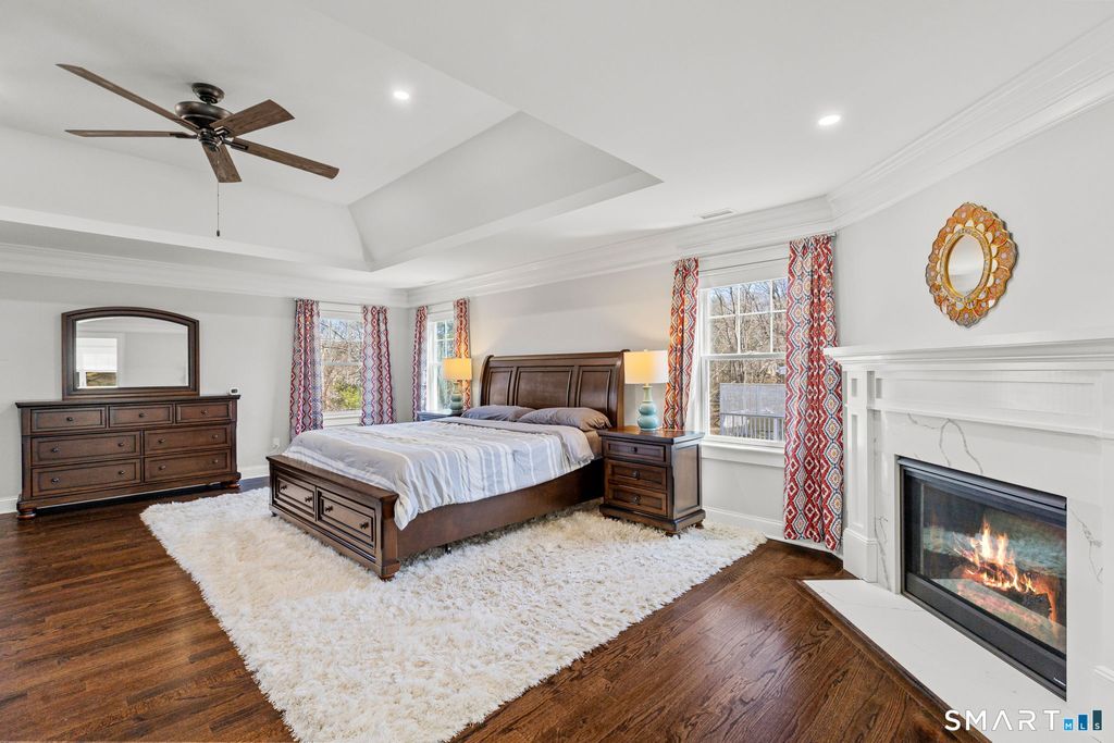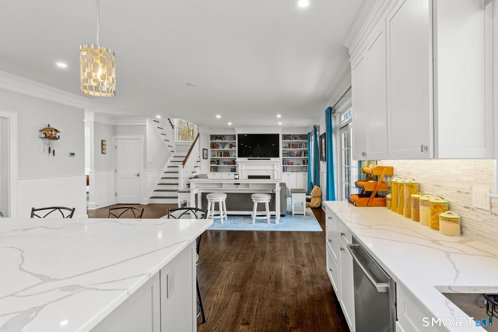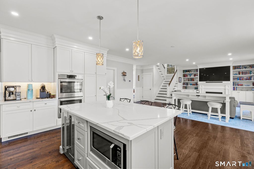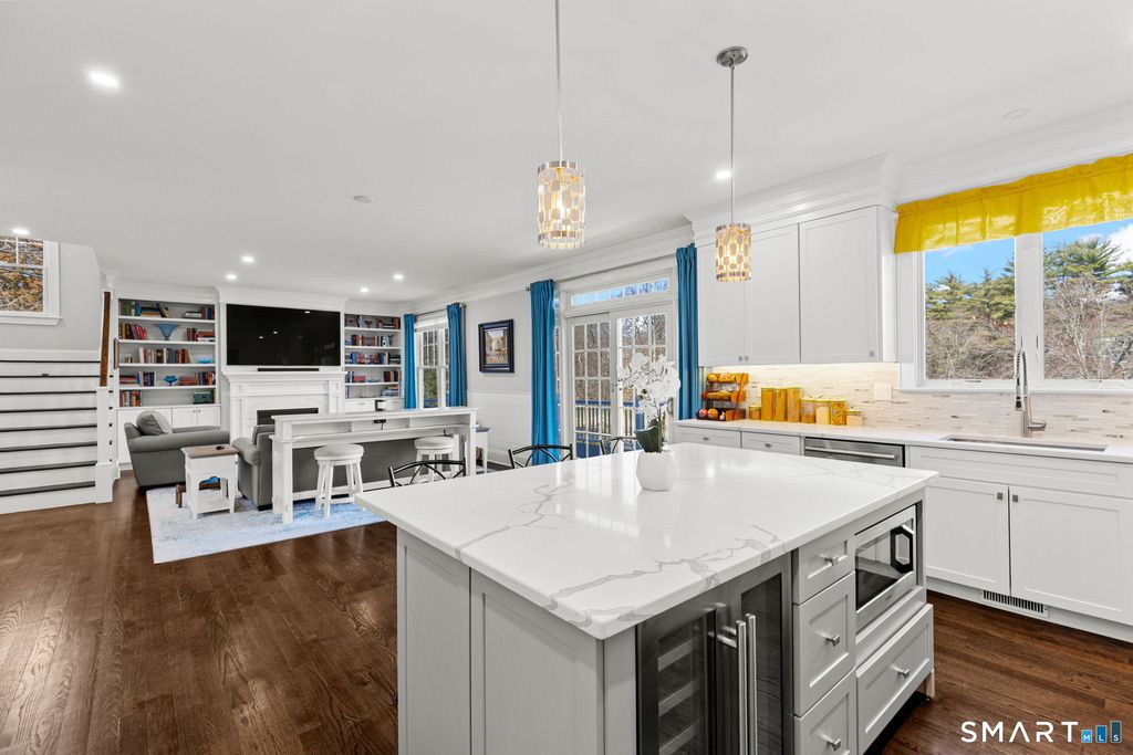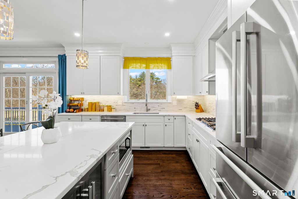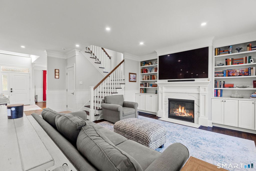 Sparkling 4-bedroom, 4-bathroom home built in 2021 on Silvermine Avenue in Norwalk, Connecticut. The open-plan first floor features a family room with a gas fireplace and custom built-in shelving, a large formal dining room, living room, and a chef's kitchen equipped with stainless steel appliances, a gas cooktop, double wall ovens, a wine cooler, and a breakfast bar - all set on hardwood flooring throughout. The kitchen and living areas open to a large deck overlooking gardens and a water feature with expansive views. The second floor features a large primary bedroom suite with tray ceilings, a gas fireplace, a walk-in closet, and a spa-style bathroom, along with three additional bedrooms and two full bathrooms. A large unfinished walk-up attic provides significant future potential. The full unfinished basement features extra-height ceilings - ideal for finishing as a recreation room, gym, or additional living space. Solar panels and a Tesla Powerwall battery system deliver energy efficiency and backup power. A two-car attached garage and meticulous curb appeal complete the property. Located in the sought-after Silvermine section of Norwalk, CT, residents enjoy proximity to the Merritt Parkway, downtown Norwalk, South Norwalk dining and shopping, and an easy commute to New York City. A move-in-ready home in Silvermine, Norwalk, Connecticut.