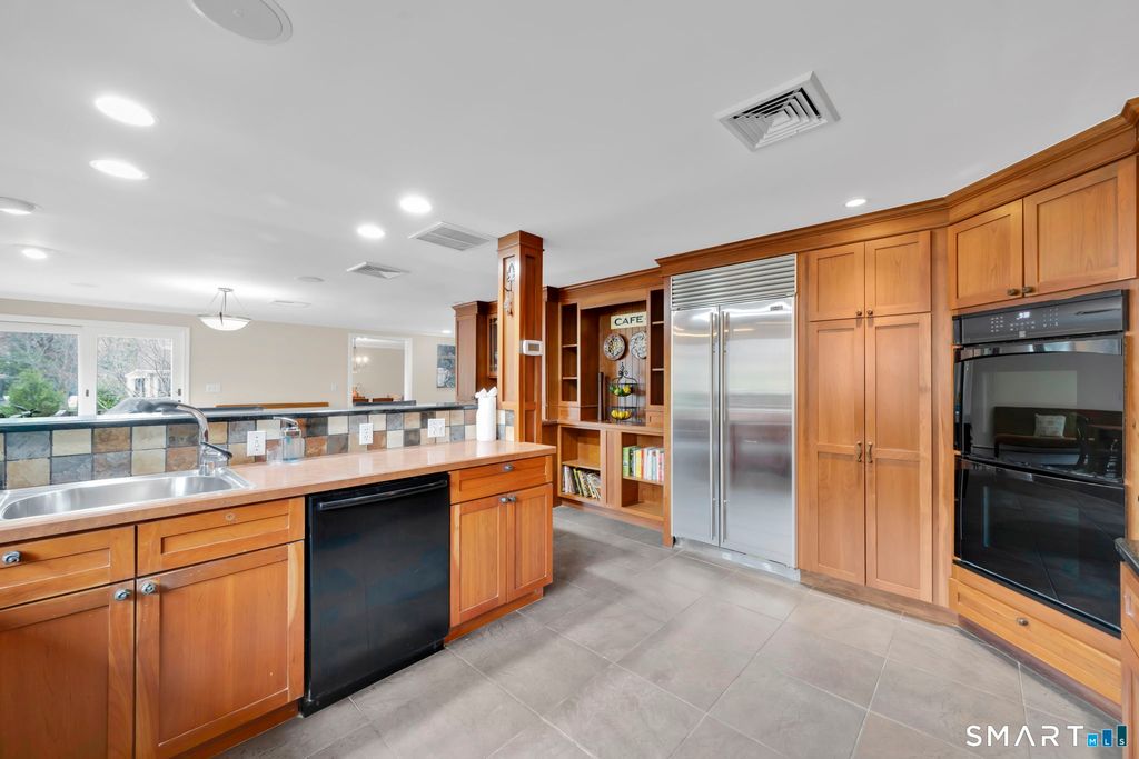 Attractive 5-bedroom colonial with a very large, remodeled kitchen (great room?). The kitchen is really quite special. It's 35x16 with a 12x16 wing off of it. Included is a center island with a breakfast bar, a separate dining area, a fireplace, and high end JBL speakers in the ceiling. There are two ovens, one conventional the second either convection or conventional. There is a separate formal dining room. Hardwood flooring is though out the house except for the kitchen and baths which are tiled. The residential setting is attractive. Winterset has limited traffic and the location is just a short walk to Hall High. Norfeldt Elementary school is nearby as well. Additional features include 5 spacious bedrooms all located on the second floor, a knotty pine den or home office on the first floor, 3 heating zones, 2 a/c zones, and 3 fireplaces included the forementioned one in the kitchen. This home has been nicely cared for and includes new triple pane windows installed in 2023.