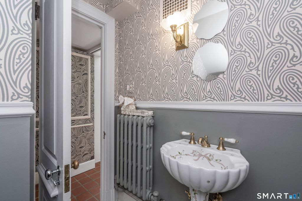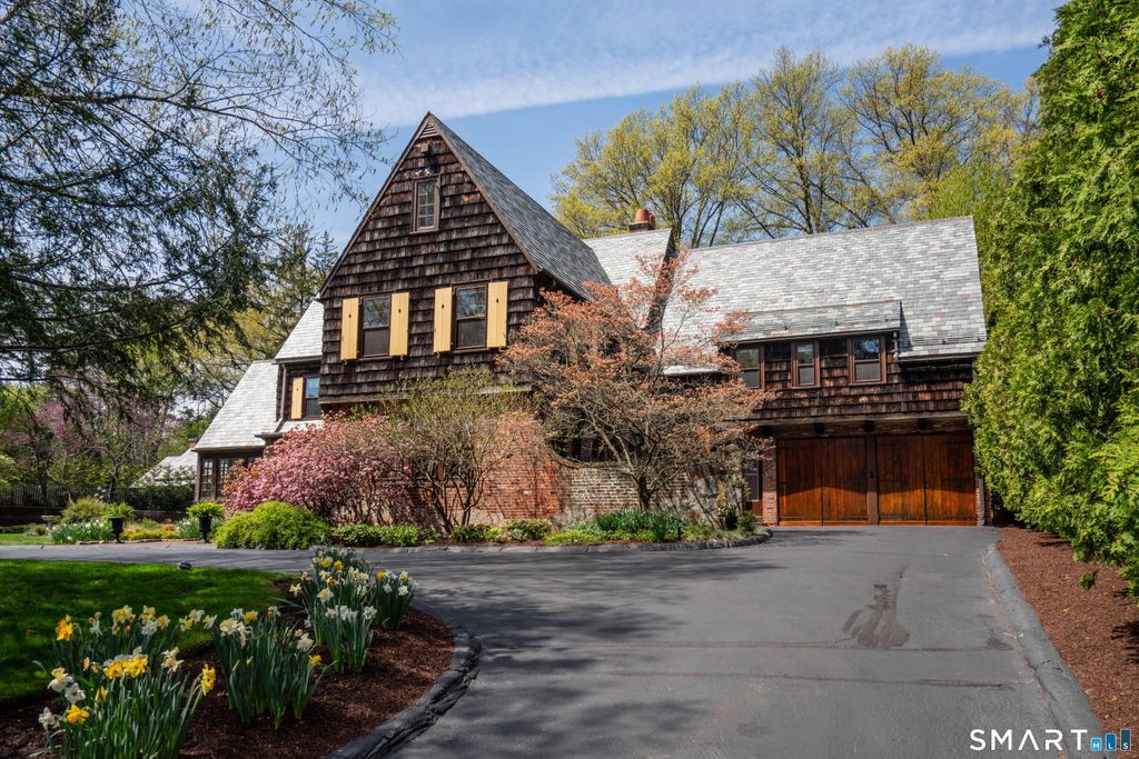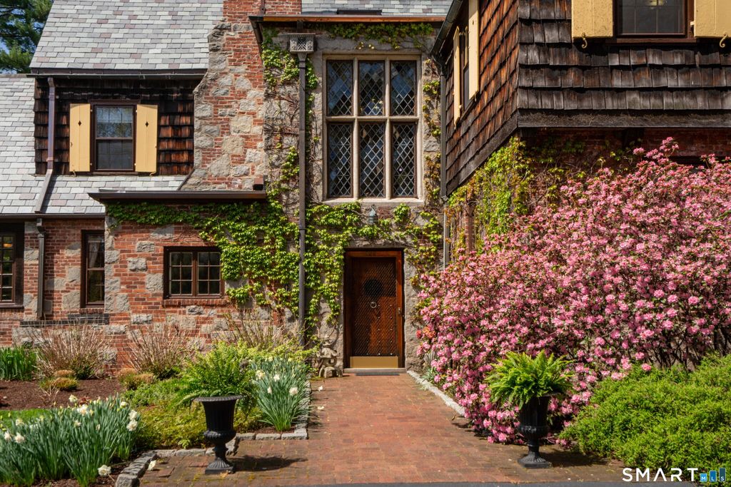 Designed by well-known Hartford architect and artist, Merrill Prentice, the home was built in 1928 with all the classic finishes of its era. These include a beautiful stained leaded glass front-facing window, beamed ceilings and carved living room wall. The entrance has a decades-old ivy and the oak Spanish style front door with a window bearing the house number in brass. Hardwood floors and high ceilings are featured throughout most of the home. Present day comforts have been added with an eye to preserving those special elements. The house is part of the West End Historic District and WECA (the West End Civic Association and many social events offering a real sense of community). Original 1928 house blueprints are available. The house is lifted from the street level by a wall made of stone and blue stone top cap. The first floor entrance includes the entry foyer, half bath and stairs to the finished basement tv room. It leads to the large main foyer, dining room, library with built-ins and fireplace, living room with original woodwork, fireplace and French doors to the patio and a lovely sunroom with original tile floor. The living room and sunroom have direct access to the patio and garden through French doors. The modern white-cabinet/Brazilian granite kitchen includes hidden panels, high-end stainless steel appliances: stove top, large oven, 2 smaller ovens (one of which is also a microwave), warming drawer, wine cooler and 1 full size plus 1/2 drawer dishwashers.