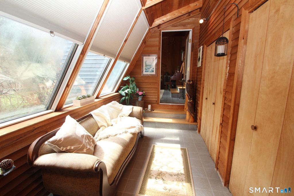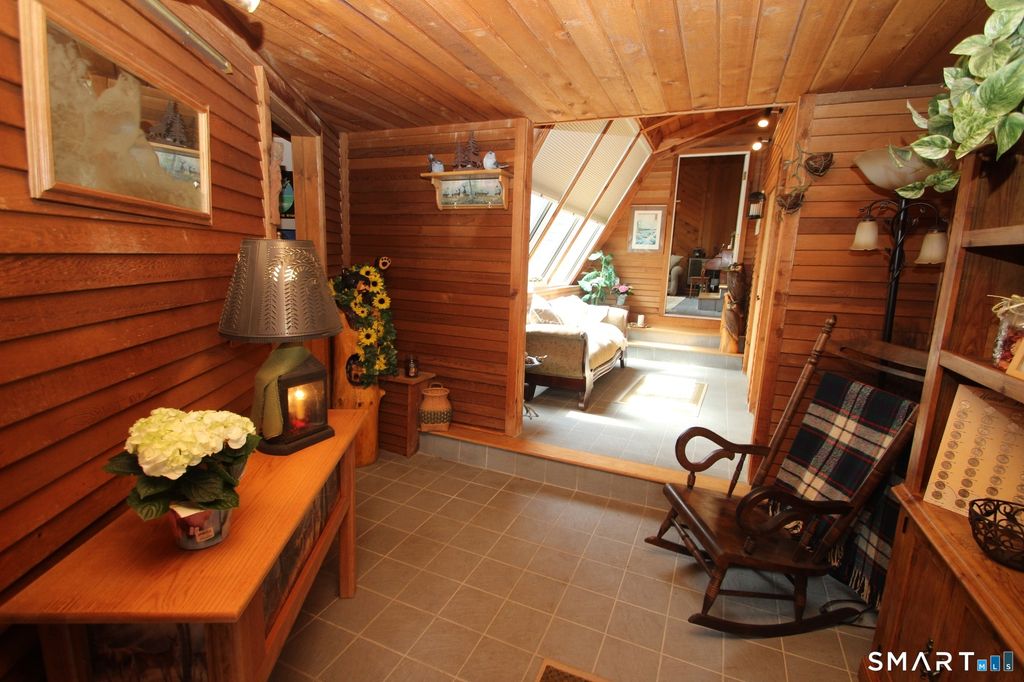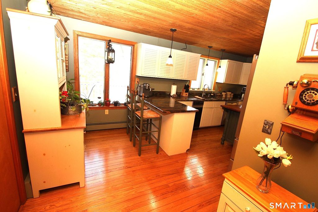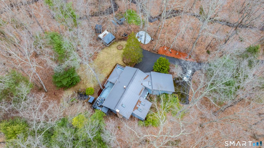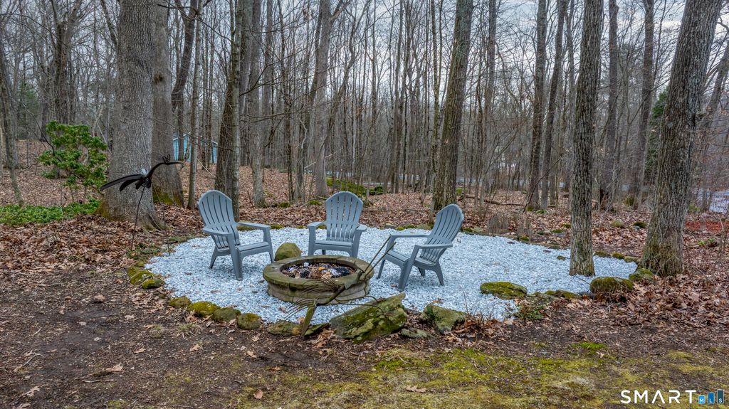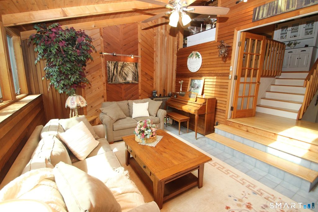 Look no further. This charming and exceptionally different multilevel style home will offer you many years of peaceful and relaxing living. Set back from the road to allow for privacy, yet located in a beautiful area of town, close to town parks, walking distance to river, and only 1.5hrs to Boston. Featuring many upgrades like Metal roof, skylights, remodeled kitchen with new DW, stove top, refrigerator and granite countertops; newly remodeled full bathroom and half bath on main floor, new driveway, new wood floors on main level, granite buffet in DR, water softener, heating system and much more. Relax and enjoy nature even in the middle of winter in your own living room with wall to wall windows for a sunny exposure and vaulted ceiling; watch your favorite games in a well designed media room with separate entrance (pool table may remain), and pellet stove. Formal dining room with vaulted ceiling adjacent to kitchen area featuring a brick fireplace and built-in buffet; family room in lower level with wall to wall built-ins, fireplace and access to a second full bathroom; additionally 3 generous bedrooms, including primary bedroom suite with separate sitting area, access to private balcony and 2 walk-in closets. Multi-level deck w gazebo, large shed, stone firepit area, chicken coop and a very private backyard with a beautiful koi pond, mature trees and abundant perennials. All this located on a country road just minutes to UConn, town play areas and major shopping.