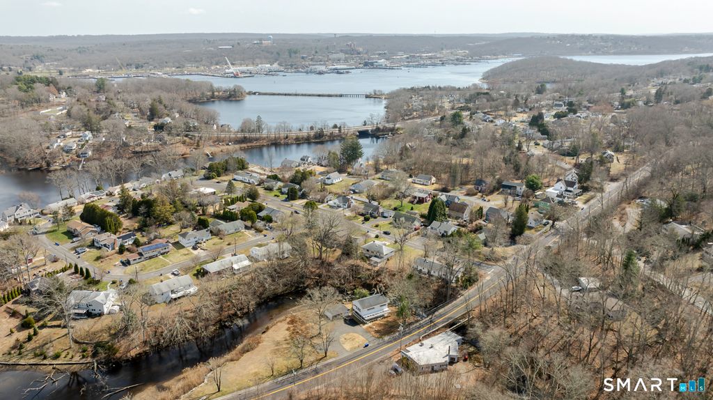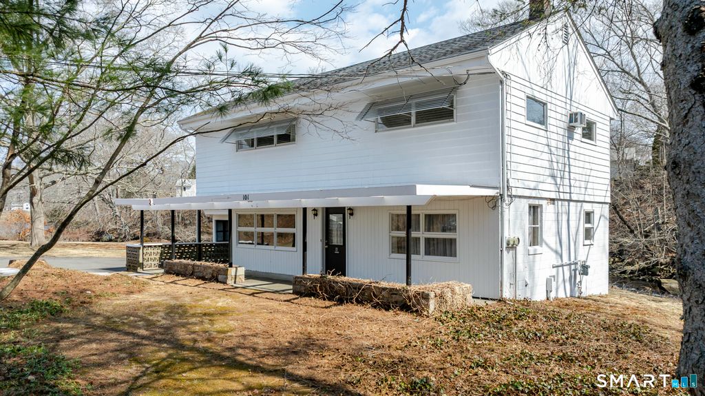 Rare opportunity to own this 2-family waterfront home on Hunts Brooks and Smith Cove in the Quaker Hill area of Waterford. Set on a level .67 acres, this stunning property offers a babbling brook that flows around the home making it the perfect place to unwind on those beautiful spring/summer days. This two-family home features a first floor 1 bedroom/1 bathroom unit with 816 sq ft. This unit offers an open kitchen/living room area, full bathroom with pedestal sink & a tub/shower combination as well as a carpeted bedroom. The second-floor unit offers a large living room that opens to an office/den area with ample windows overlooking the yard and letting in tons of natural light. The dining area flows into the kitchen appointed with granite counters, wood cabinets and offers access out to the rear deck/stairs. Two more generously sized bedrooms both gleaming hardwood floors and ample closet space and a full bathroom with a tub/shower combination round out this lovely unit. This home offers gas heat, public water & public sewer as well as laundry hookups in the unfinished space. Don't miss this fantastic investment opportunity!!! Estate Sale being sold in AS-IS condition.