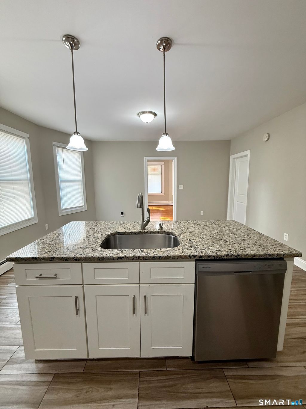 Charming first-floor apartment with 2 spacious bedrooms featuring brand new carpets, offering comfort and a soft touch. Experience culinary delight in a modern kitchen equipped with stunning granite countertops and a beautiful island, perfect for entertaining or casual meals. In-unit laundry hook-up for added convenience, making laundry days a breeze. Situated in a neighborhood that is close to local amenities, parks, and public transport. The tenants are responsible for all utilities except cold water.
