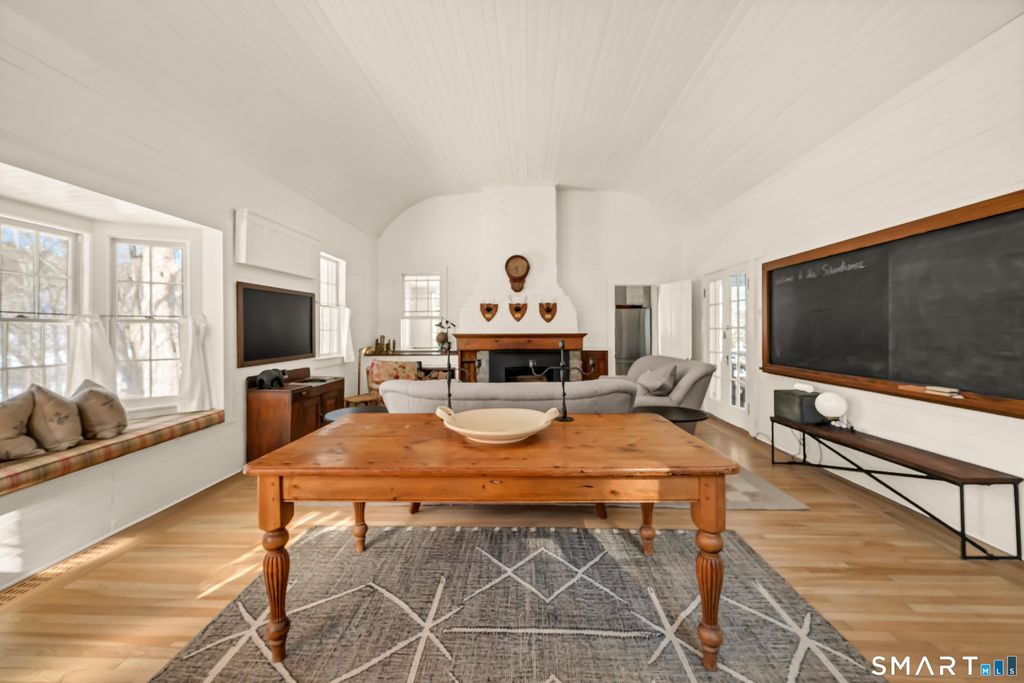 $4000. per week with a two-week minimum for this rare summer retreat: a thoughtfully updated former schoolhouse, rich in history and beautifully positioned in one of Litchfield County's most desirable and quiet river corridors, with direct Lake Lillinonah frontage and a privately set gunite pool, just 90 minutes from Manhattan. This idyllic location in a charming village, with a great market/cafe, parks, and walking trails, offers easy access to the theater, restaurants, and the conveniences of the historic Green in New Milford. It is also a short drive to Washington Depot for taverns, conveniences, art events, and restaurants. Inside, the heart of the home is the original schoolroom, now a main-level living space with a barrel ceiling and central fireplace. This extraordinary room serves as a comfortable place to gather, relax, or dine. Wood floors and cedar closets run throughout the three-bedroom, two-bath residence, adding warmth. The retro-style kitchen features a cozy corner banquette with open views to the outdoors. A screened dining porch invites long, lingering summer meals overlooking a babbling stream and lush greenery. A footbridge leads to the privately nestled gunite pool, completing an exquisite and rare setting, and an unforgettable place to spend the summer. Availabiliity 5/31/26-7/15/26 and 8/18/26-9/18/26 two week minimum $4000. per week.