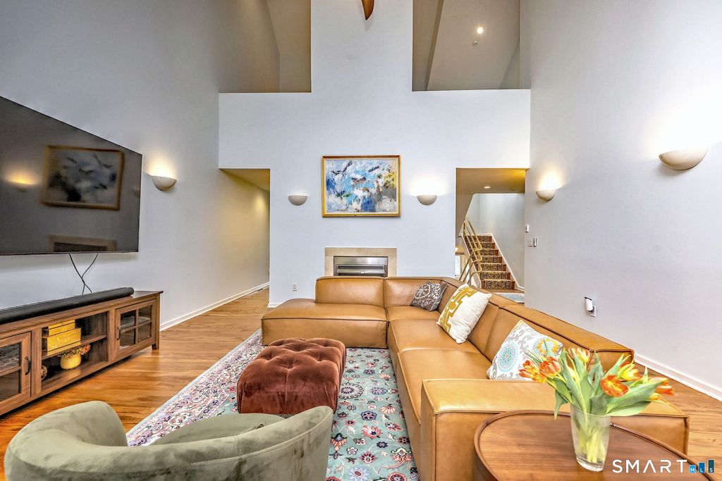 Oronoque Forest Complex. Step into this exquisite 3-level townhouse, end unit, featuring soaring cathedral ceilings and a dramatic fireplace wall that creates an impressive focal point. The open concept layout offers a seamless flow, highlighted by a spacious living room with sliders leading to a large deck-perfect for relaxing. The main level also includes the dining room and remodeled eat in kitchen with newer stainless-steel appliances. Additional sliders open to a second deck with stairs. A versatile den or home office along with a wet bar complete with wine cooler adds to the home's functionality. The primary bedroom suite boasts a private updated bath with heated floor, and generous his & hers closets. Upstairs the interior loft overlooks the main living space and leads to two additional bedrooms and bath. Enjoy wood floors throughout and a lower-level family/media room with another full updated bath. Additional highlights include awnings on both decks, blinds with remotes, a generator, several windows have been replaced & both sliding glass doors were updated. Two car garage with epoxy floor and well-organized storage space with plenty of cabinets. A perfect blend of comfort, smart upgrades & move in ready. Cul-de-sac location. Complex has pool, tennis, pickle ball & clubhouse and parklike grounds. Located next to Hopkins School, minutes to Yale, hospitals, universities & train station. Exterior video.