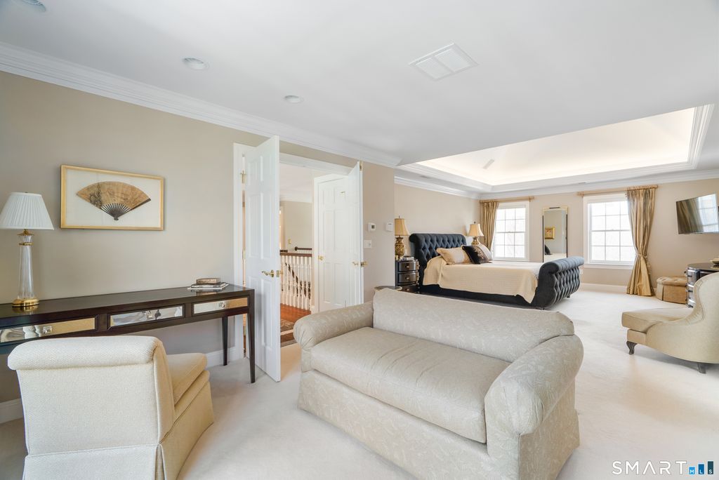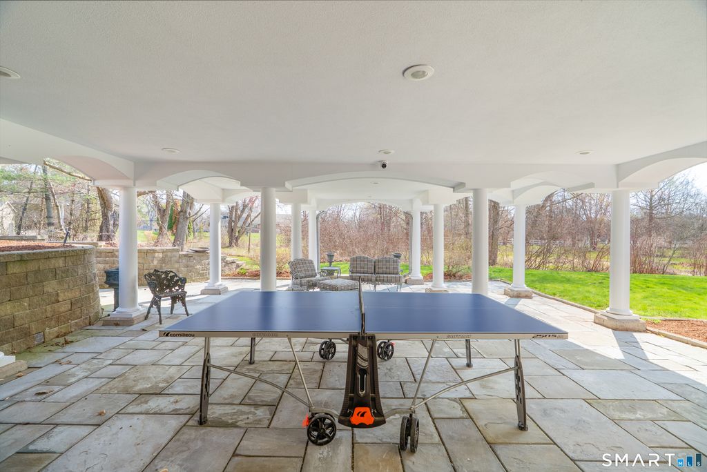 Nestled on 4 private acres at the end of a quiet cul-de-sac in Suffield, this magnificent 1993-built Georgian Colonial offers a commanding presence with an elegant tree-lined paver driveway, grand columned portico, and cream brick facade. Delivering an extraordinary lifestyle at every turn with 6 bedrooms, 4 full and 2 half baths, a 3-car garage, and park-like, professionally landscaped grounds. Inside, you are greeted with a two-story entry leading to a formal living room and a sun-drenched entertaining room with soaring cathedral ceilings, built-in wet bar, walls of arched windows, and French doors opening to the wrap-around Ipe hardwood deck. The kitchen dazzles with custom white cabinetry, a large island with granite counters, gas cooktop, and a tray ceiling. Off the kitchen is a first-floor bedroom/office with a full bath. An elegant formal dining room and cozy family room with fireplace and beautiful built-ins round out the first floor. Upstairs, the primary suite is a true sanctuary featuring a dramatic tray ceiling, spa bath with marble soaking tub, glass block walk-in shower, skylight, and dual walk-in closets. Two more bedrooms with a Jack and Jill bath finish the second level. The finished lower level - with walk-out access and a possible in-law suite with separate entry - includes a home theater, wet bar, recreation room, massage room, and additional bedroom suite. Minutes to golf, Enfield Mall shopping, Suffield Academy, and historic Suffield town center.